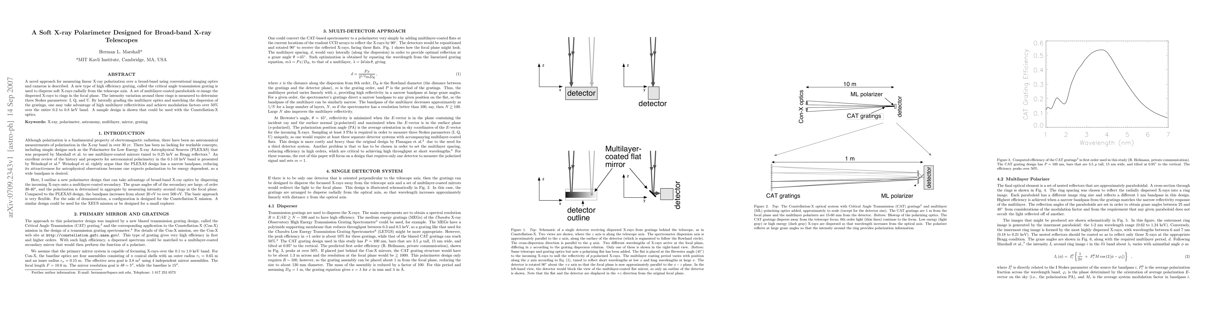 A novel approach for measuring linear X-ray polarization over a broad-band using conventional imaging optics and cameras is described. A new type of high efficiency grating, called the critical angle transmission grating is used to disperse soft X-rays radially from the telescope axis. A set of multilayer-coated paraboloids re-image the dispersed X-rays to rings in the focal plane. The intensity variation around these rings is measured to determine three Stokes parameters: I, Q, and U. By laterally grading the multilayer optics and matching the dispersion of the gratings, one may take advantage of high multilayer reflectivities and achieve modulation factors over 50% over the entire 0.2 to 0.8 keV band. A sample design is shown that could be used with the Constellation-X optics.