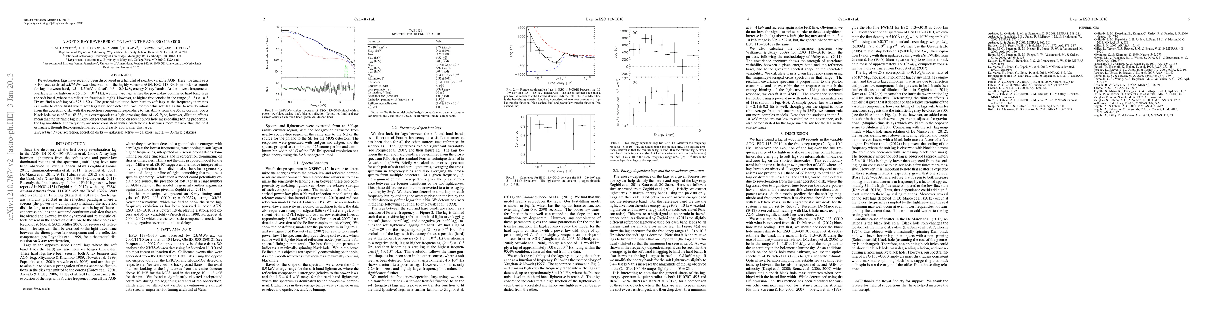 This study analyzes XMM-Newton observations of the AGN ESO 113-G010, revealing a soft X-ray reverberation lag at higher frequencies, interpreted as reverberation from the accretion disk. The observed lag suggests a black hole mass potentially higher than current estimates, though intrinsic lags may be longer due to dilution effects.