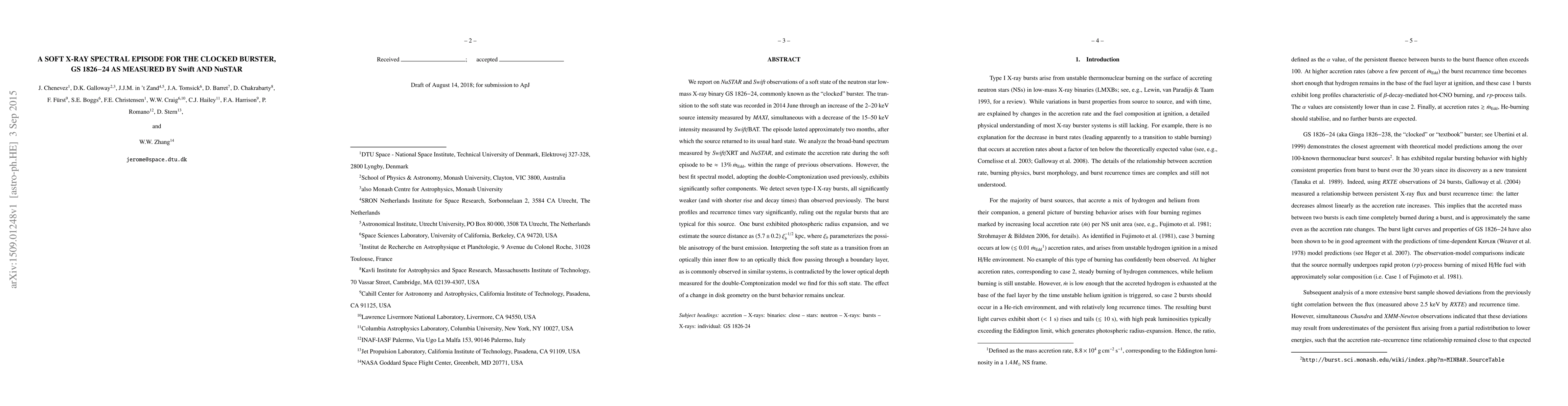 NuSTAR and Swift observations reveal GS 1826-24, or the 'clocked burster', in a soft X-ray state lasting about two months in 2014. The spectrum, analyzed via broad-band data, shows a lower optical depth than previous models suggested, challenging the optically thin to thick inner flow transition theory. Seven type-I X-ray bursts were detected, notably weaker and varying in profile, with one burst indicating a source distance of approximately 5.7 kpc.