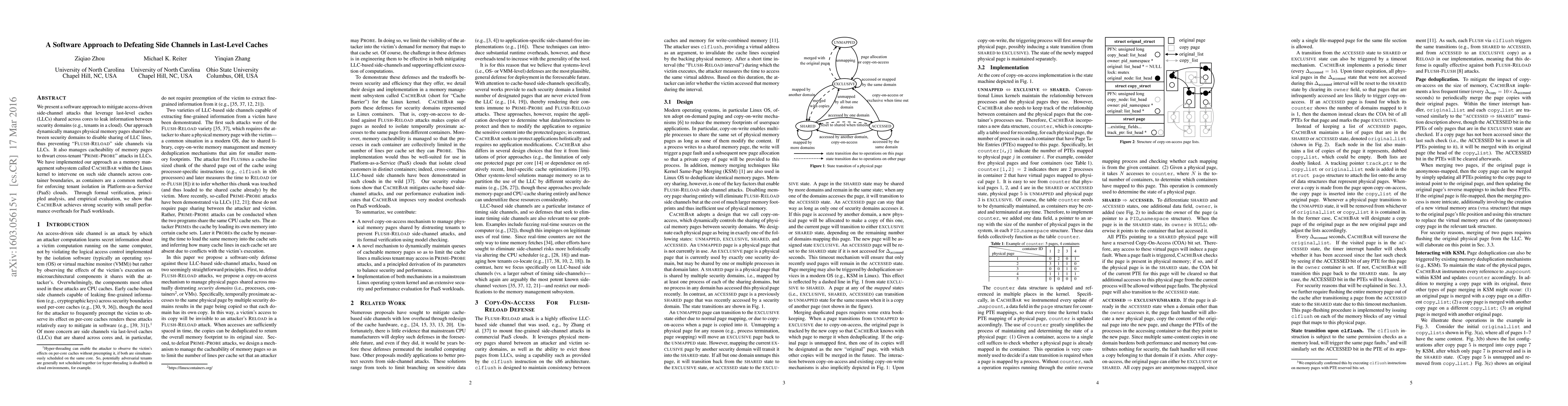 This paper introduces CacheBar, a software-based memory management subsystem in the Linux kernel, to mitigate side-channel attacks exploiting last-level caches (LLCs) in cloud environments. CacheBar dynamically manages shared memory pages to prevent "Flush-Reload" and "Prime-Probe" attacks, achieving strong security with minimal performance overhead.