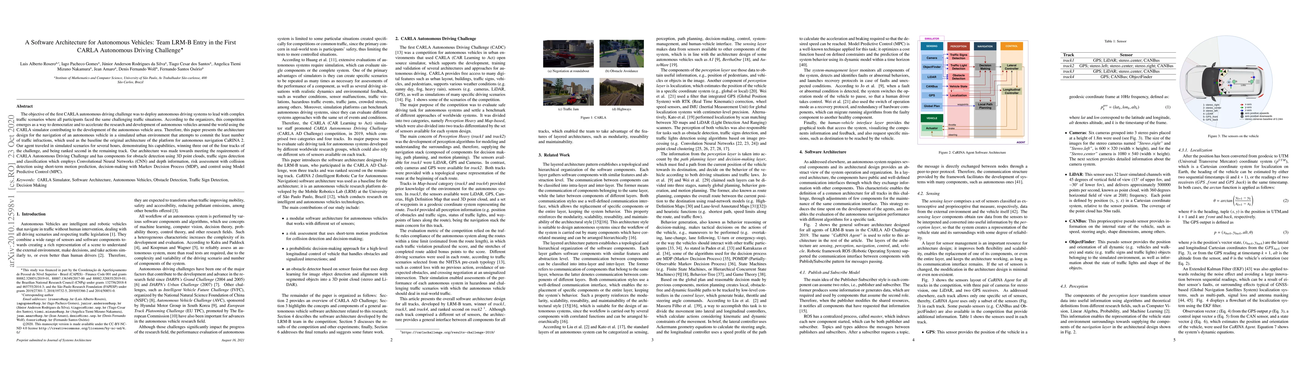 This paper details the software architecture developed by Team LRM-B for an autonomous vehicle that participated in the first CARLA Autonomous Driving Challenge, achieving high rankings by minimizing traffic infractions. The architecture integrates components for obstacle detection, traffic sign classification, risk assessment, decision-making via Markov Decision Process, and control using Model Predictive Control.