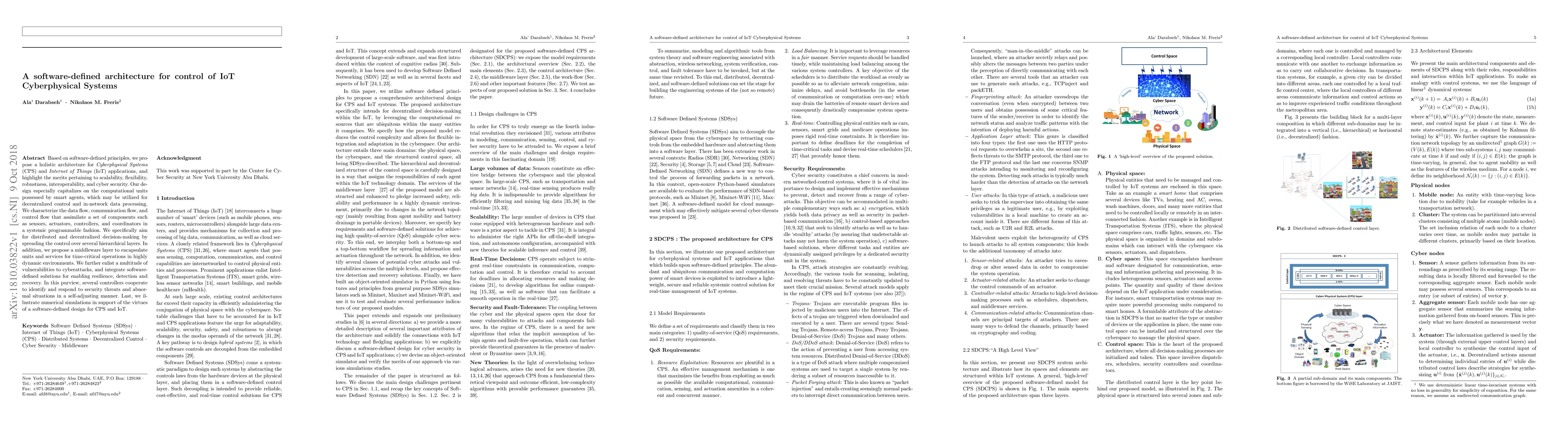This paper proposes a software-defined architecture for IoT Cyberphysical Systems, emphasizing scalability, flexibility, and interoperability through decentralized control and in-network data processing. It introduces a middleware layer for time-critical operations and integrates security solutions to enhance resilience and threat detection.