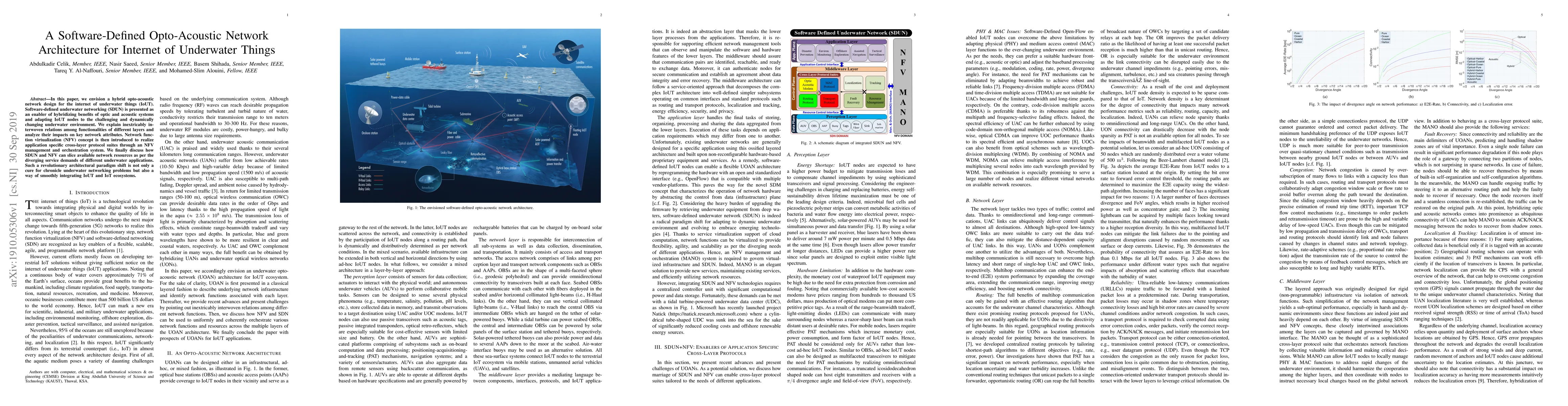 This paper proposes a hybrid opto-acoustic network architecture for the Internet of Underwater Things (IoUT) utilizing software-defined underwater networking (SDUN) and network function virtualization (NFV) to adapt to dynamic underwater conditions and meet diverse application demands. The architecture integrates cross-layer protocols and slices network resources for different services, aiming to unify the IoUT and IoT ecosystems.