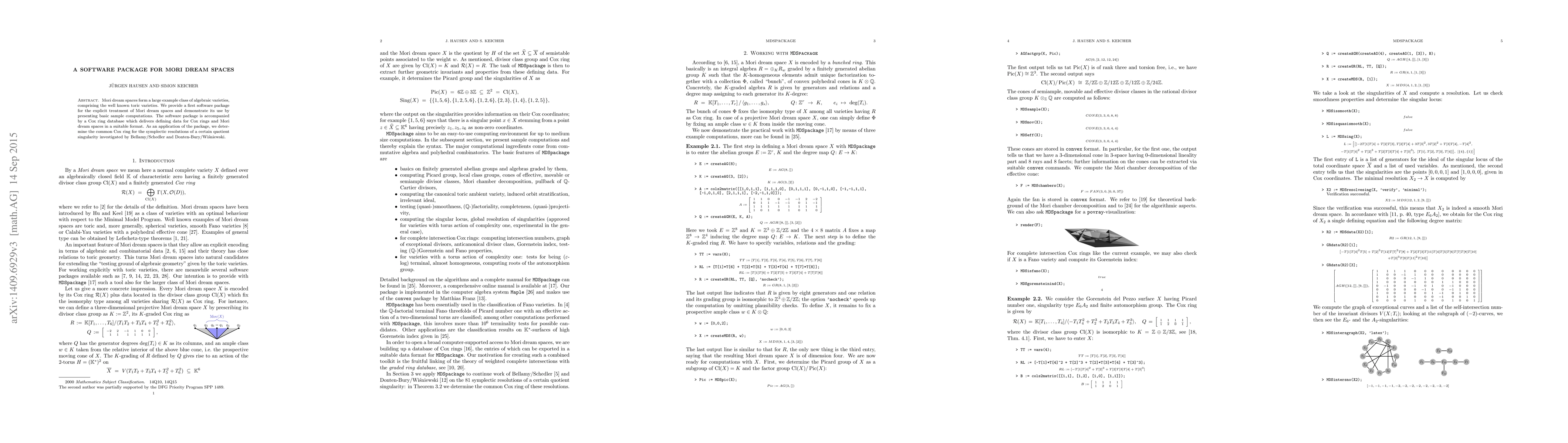 Mori dream spaces form a large example class of algebraic varieties, comprising the well known toric varieties. We provide a first software package for the explicit treatment of Mori dream spaces and demonstrate its use by presenting basic sample computations. The software package is accompanied by a Cox ring database which delivers defining data for Cox rings and Mori dream spaces in a suitable format. As an application of the package, we determine the common Cox ring for the symplectic resolutions of a certain quotient singularity investigated by Bellamy/Schedler and Donten-Bury/Wi\'sniewski.
