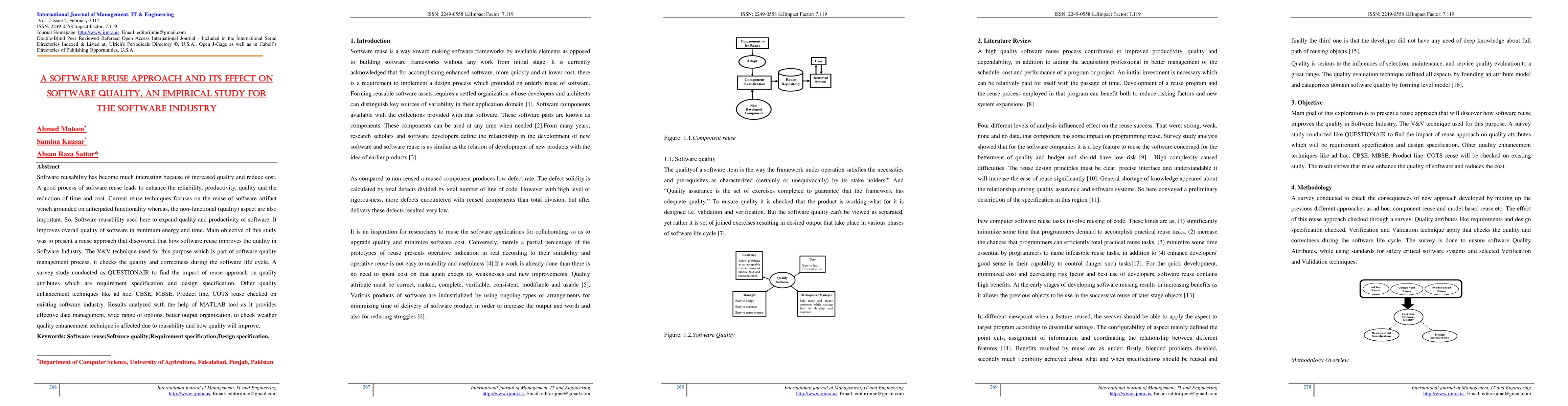 This study investigates a software reuse approach aimed at enhancing software quality and productivity, focusing on non-functional aspects like requirement and design specifications. The research employs a survey and MATLAB analysis to determine the impact of various reuse techniques on software quality, revealing that effective reuse can significantly improve quality with reduced time and cost.