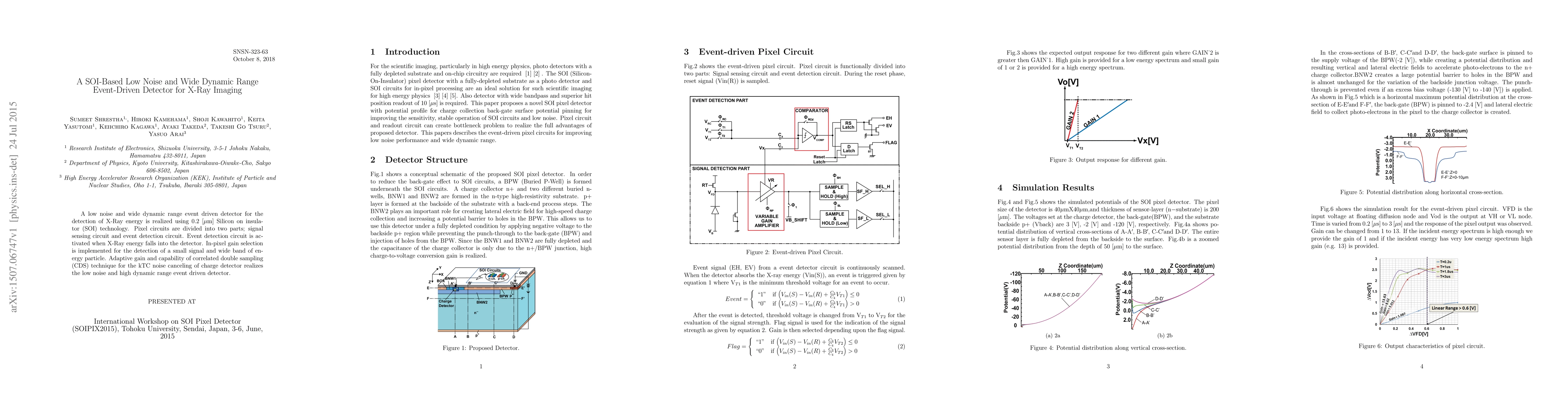 A low noise and wide dynamic range event driven detector for the detection of X-Ray energy is realized using 0.2 [um] Silicon on insulator (SOI) technology. Pixel circuits are divided into two parts; signal sensing circuit and event detection circuit. Event detection circuit is activated when X-Ray energy falls into the detector. In-pixel gain selection is implemented for the detection of a small signal and wide band of energy particle. Adaptive gain and capability of correlated double sampling (CDS) technique for the kTC noise canceling of charge detector realizes the low noise and high dynamic range event driven detector.