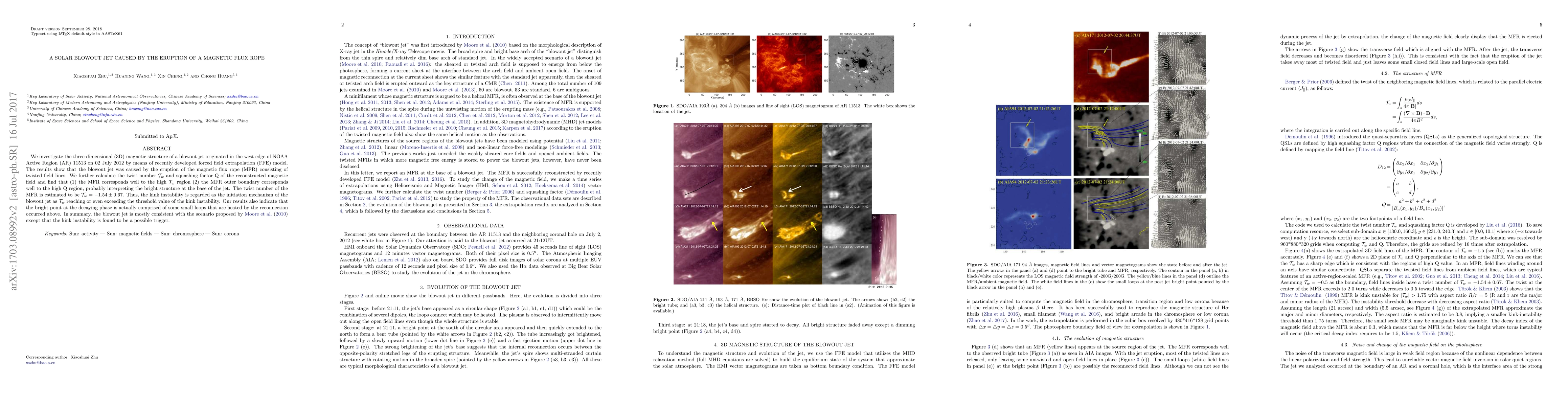 Researchers used a new model to study a solar blowout jet and found it was caused by the eruption of a magnetic flux rope with twisted field lines, which triggered kink instability.