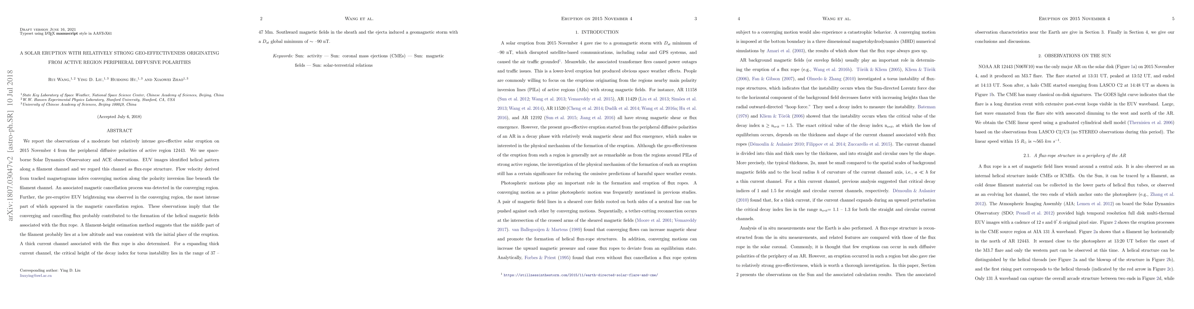 This paper reports a geo-effective solar eruption on November 4, 2015, originating from peripheral diffusive polarities of active region 12443, characterized by a helical filament channel and flux rope structure. The eruption's formation was likely influenced by converging and cancelling magnetic flux, leading to a geomagnetic storm with a Dst minimum of ~-90 nT.