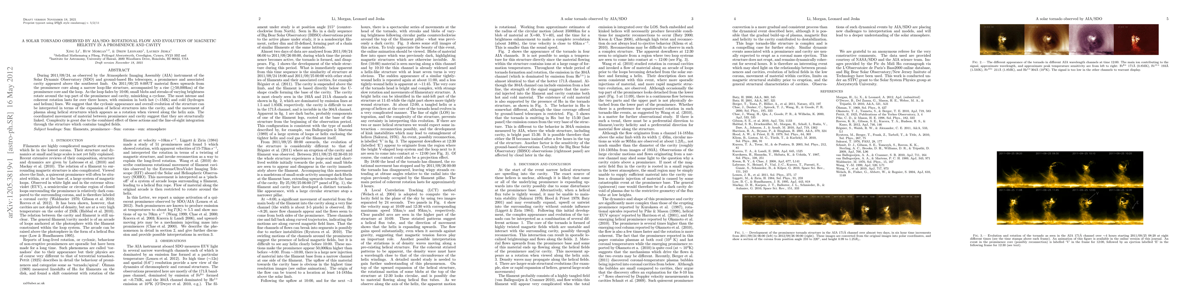 This paper reports the observation of a solar tornado above the southwest limb of the Sun, characterized by rotational flows and the evolution of magnetic helicity in a prominence and associated cavity. The phenomenon, observed by AIA/SDO and ground-based telescopes, involves a prominent upward flow and rotation resembling a cyclone, suggesting structural linkage between the prominence and cavity.