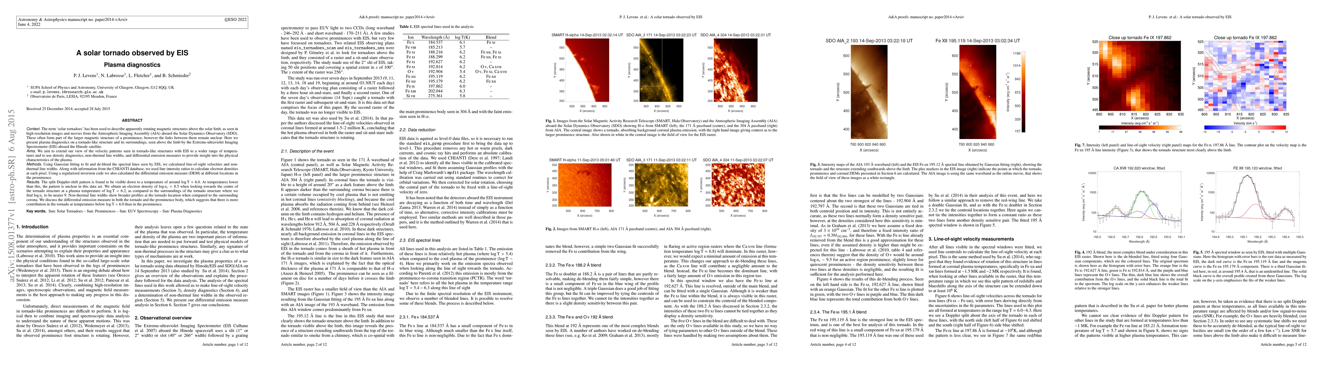 This paper investigates a solar tornado observed by the EIS aboard the Hinode satellite, analyzing plasma diagnostics to understand its velocity patterns and physical characteristics. The study reveals higher electron densities and broader non-thermal line widths in the tornado compared to its surroundings, suggesting distinct physical properties.