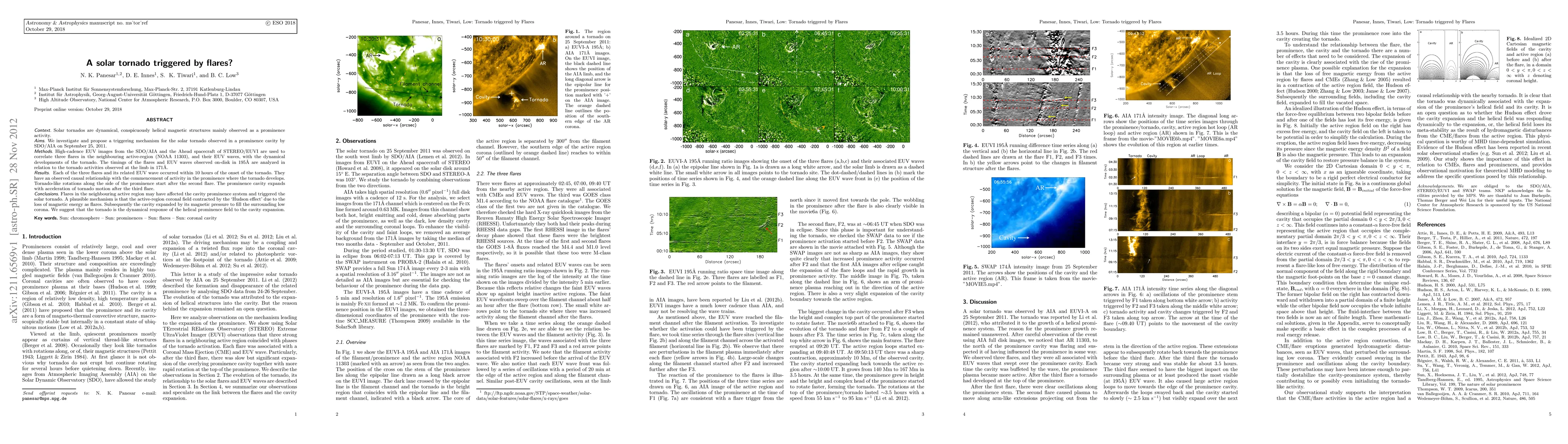 This research investigates the solar tornado observed in a prominence cavity on September 25, 2011, proposing that flares in a neighboring active region triggered its formation. The study links the timing of three flares and their associated EUV waves to the tornado's activity, suggesting that the flares caused the coronal field contraction and subsequent prominence cavity expansion, leading to the tornado's helical motion.
