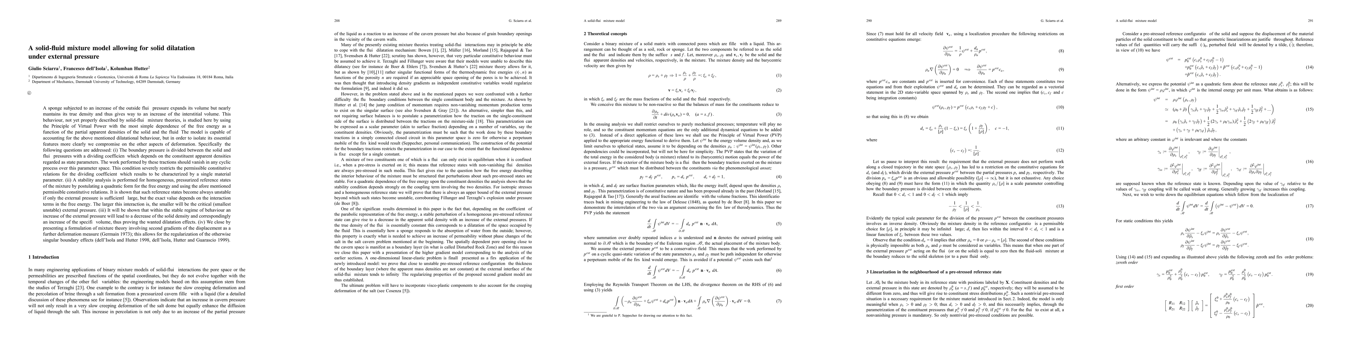 A sponge subjected to an increase of the outside fluid pressure expands its volume but nearly mantains its true density and thus gives way to an increase of the interstitial volume. This behaviour, not yet properly described by solid-fluid mixture theories, is studied here by using the Principle of Virtual Power with the most simple dependence of the free energy as a function of the partial apparent densities of the solid and the fluid. The model is capable of accounting for the above mentioned dilatational behaviour, but in order to isolate its essential features more clearly we compromise on the other aspects of deformation.