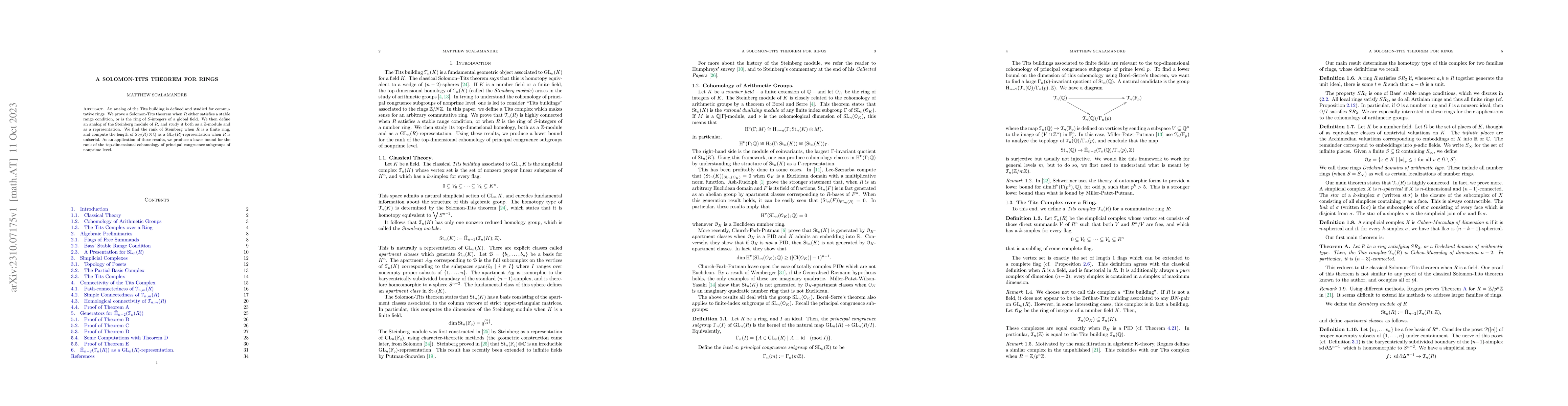 This paper establishes a Solomon-Tits theorem for commutative rings, defining an analog of the Tits building and studying it under stable range conditions or as $S$-integers of global fields. It also investigates the rank of the Steinberg module for finite rings and computes the length of $\text{St}_2(R)\otimes\mathbb{Q}$ for uniserial rings, applying these findings to derive a lower bound for the cohomology of principal congruence subgroups.