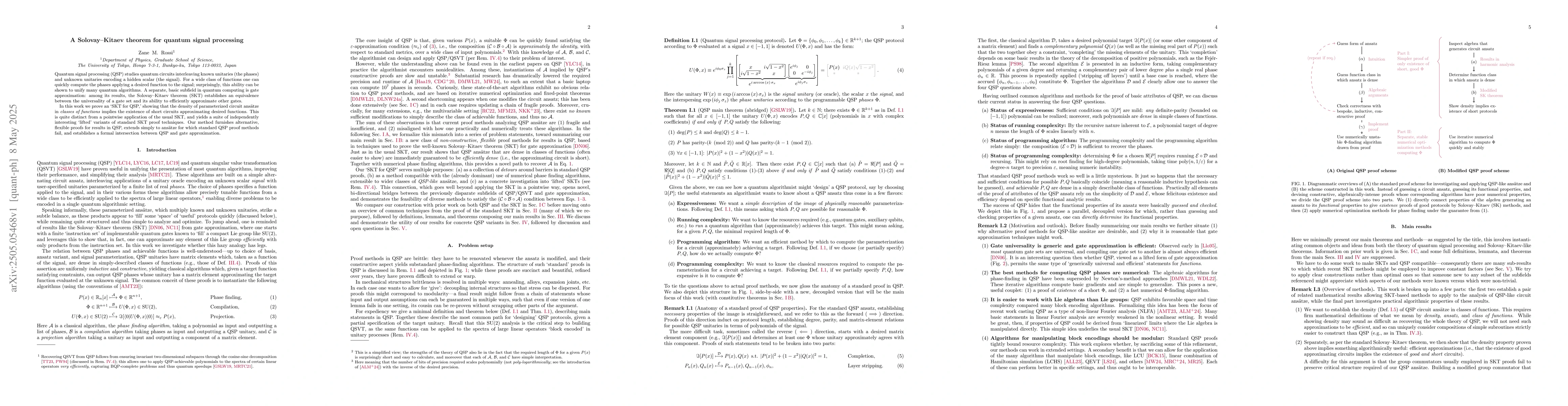 Quantum signal processing (QSP) studies quantum circuits interleaving known unitaries (the phases) and unknown unitaries encoding a hidden scalar (the signal). For a wide class of functions one can quickly compute the phases applying a desired function to the signal; surprisingly, this ability can be shown to unify many quantum algorithms. A separate, basic subfield in quantum computing is gate approximation: among its results, the Solovay-Kitaev theorem (SKT) establishes an equivalence between the universality of a gate set and its ability to efficiently approximate other gates. In this work we prove an 'SKT for QSP,' showing that the density of parameterized circuit ans\"atze in classes of functions implies the existence of short circuits approximating desired functions. This is quite distinct from a pointwise application of the usual SKT, and yields a suite of independently interesting 'lifted' variants of standard SKT proof techniques. Our method furnishes alternative, flexible proofs for results in QSP, extends simply to ans\"atze for which standard QSP proof methods fail, and establishes a formal intersection between QSP and gate approximation.