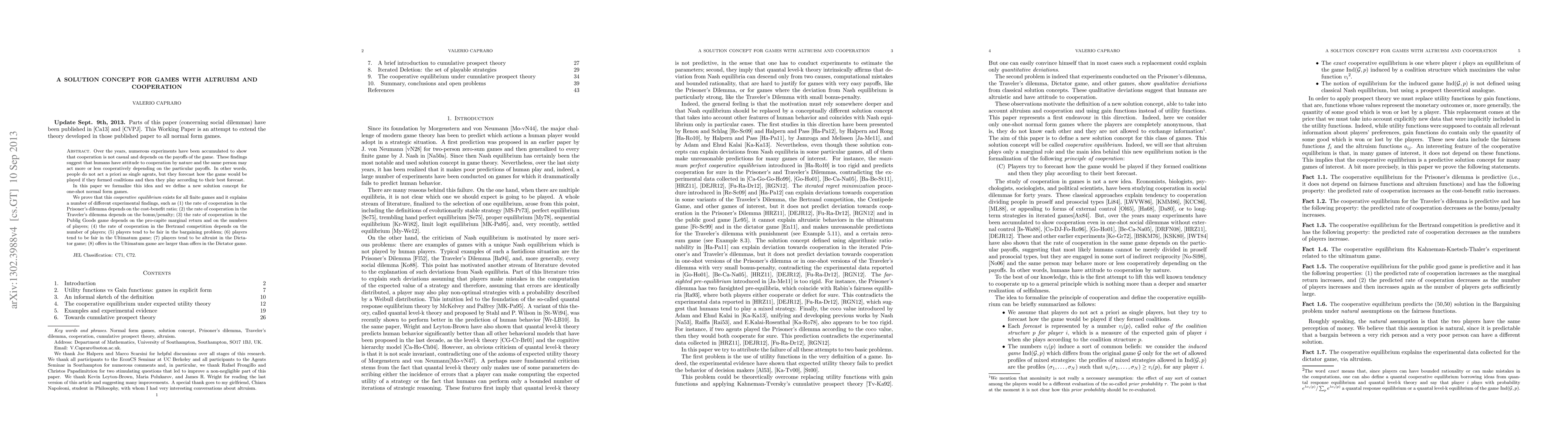 Over the years, numerous experiments have been accumulated to show that cooperation is not casual and depends on the payoffs of the game. These findings suggest that humans have attitude to cooperation by nature and the same person may act more or less cooperatively depending on the particular payoffs. In other words, people do not act a priori as single agents, but they forecast how the game would be played if they formed coalitions and then they play according to their best forecast. In this paper we formalize this idea and we define a new solution concept for one-shot normal form games. We prove that this \emph{cooperative equilibrium} exists for all finite games and it explains a number of different experimental findings, such as (1) the rate of cooperation in the Prisoner's dilemma depends on the cost-benefit ratio; (2) the rate of cooperation in the Traveler's dilemma depends on the bonus/penalty; (3) the rate of cooperation in the Publig Goods game depends on the pro-capite marginal return and on the numbers of players; (4) the rate of cooperation in the Bertrand competition depends on the number of players; (5) players tend to be fair in the bargaining problem; (6) players tend to be fair in the Ultimatum game; (7) players tend to be altruist in the Dictator game; (8) offers in the Ultimatum game are larger than offers in the Dictator game.