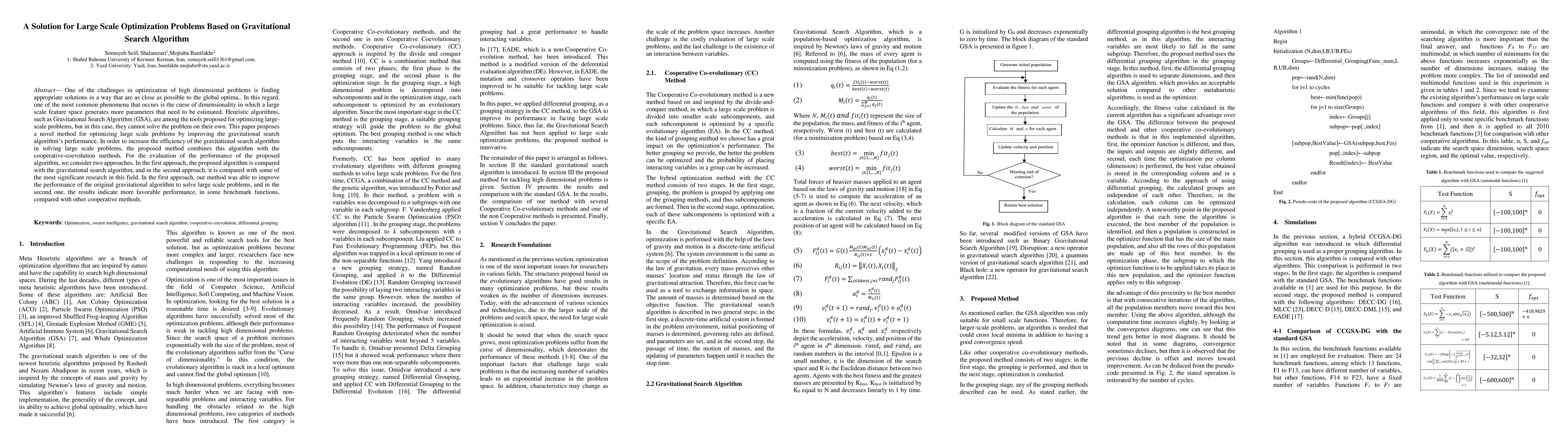 One of the challenges in optimization of high dimensional problems is finding appropriate solutions in a way that are as close as possible to the global optima. In this regard, one of the most common phenomena that occurs is the curse of dimensionality in which a large scale feature space generates more parameters that need to be estimated. Heuristic algorithms, such as Gravitational Search Algorithm, are among the tools proposed for optimizing large-scale problems, but in this case, they cannot solve the problem on their own. This paper proposes a novel method for optimizing large scale problems by improving the gravitational search algorithm's performance. In order to increase the efficiency of the gravitational search algorithm in solving large scale problems, the proposed method combines this algorithm with the cooperative-coevolution methods. For the evaluation of the performance of the proposed algorithm, we consider two approaches. In the first approach, the proposed algorithm is compared with the gravitational search algorithm, and in the second approach, it is compared with some of the most significant research in this field. In the first approach, our method was able to improve the performance of the original gravitational algorithm to solve large scale problems, and in the second one, the results indicate more favorable performance, in some benchmark functions, compared with other cooperative methods.