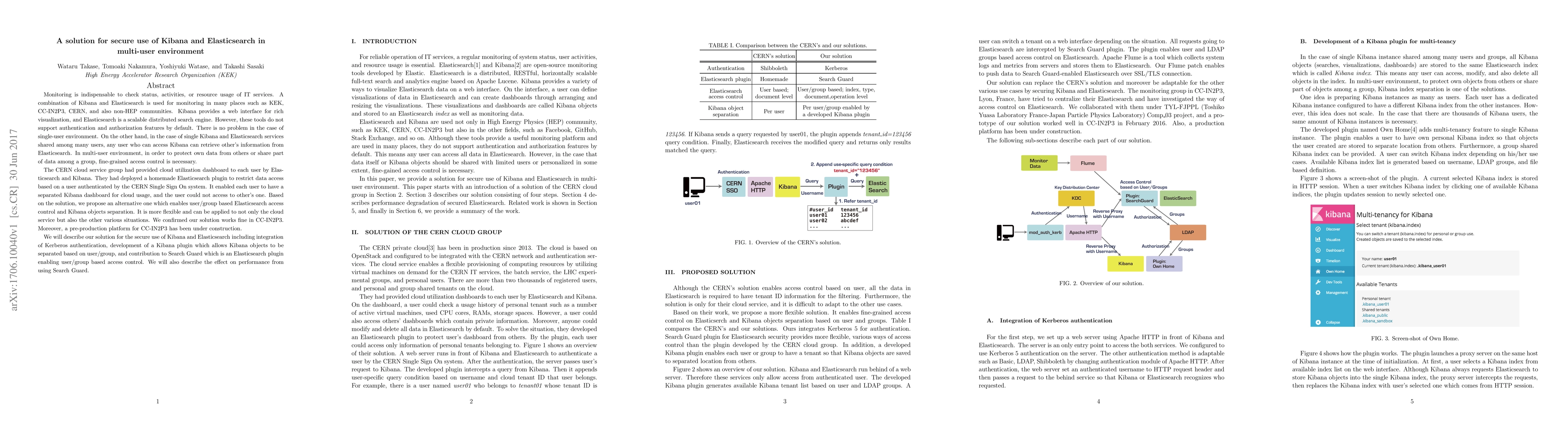 This paper proposes a secure solution for using Kibana and Elasticsearch in multi-user environments, integrating Kerberos authentication and developing a Kibana plugin for user/group-based separation of Kibana objects, along with contributions to the Search Guard plugin for Elasticsearch. The solution was successfully implemented and tested in CC-IN2P3.