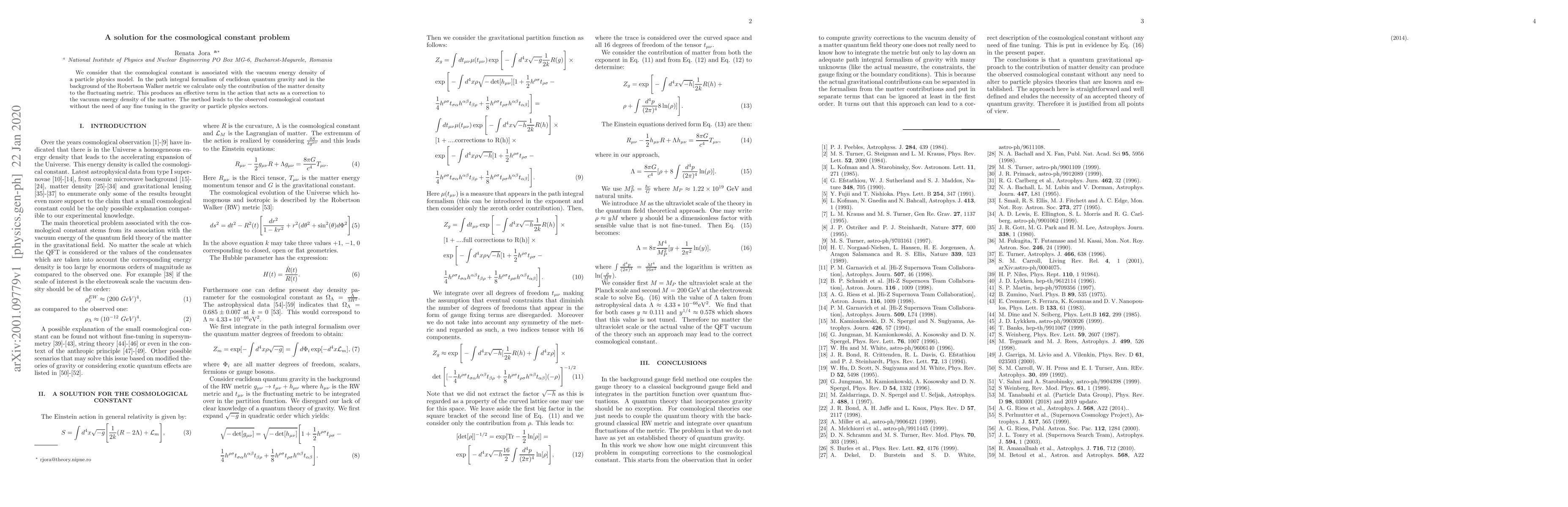 We consider that the cosmological constant is associated with the vacuum energy density of a particle physics model. In the path integral formalism of euclidean quantum gravity and in the background of the Robertson Walker metric we calculate only the contribution of the matter density to the fluctuating metric. This produces an effective term in the action that acts as a correction to the vacuum energy density of the matter. The method leads to the observed cosmological constant without the need of any fine tuning in the gravity or particle physics sectors.