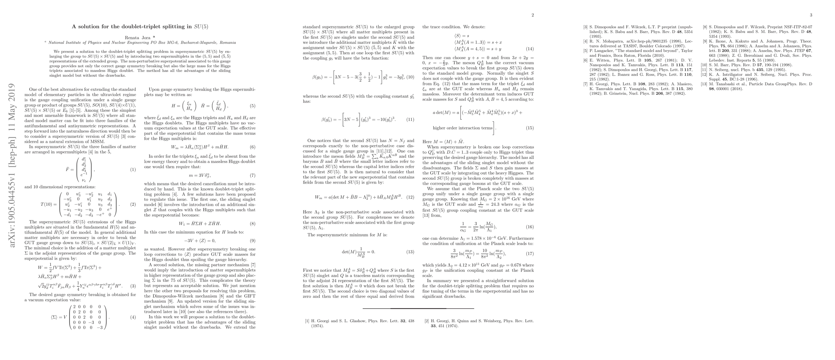 This paper proposes a solution to the doublet-triplet splitting problem in supersymmetric $SU(5)$ by extending the group to $SU(5)\times SU(5)$ and introducing two supermultiplets. This approach achieves the correct gauge symmetry breaking and large mass for Higgs triplets without the disadvantages of the sliding singlet model.