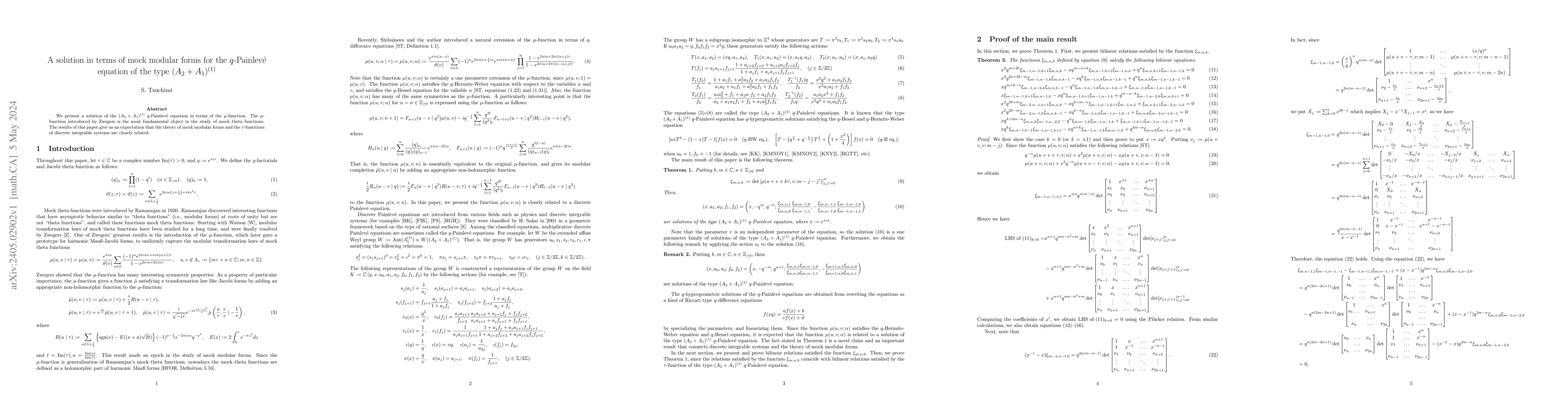 The paper presents a solution to the $(A_2+A_1)^{(1)}$ $q$-Painlevé equation using Zwegers' $\mu$-function, a key object in mock theta functions, suggesting a close relationship between mock modular forms and $\tau$-functions in discrete integrable systems.