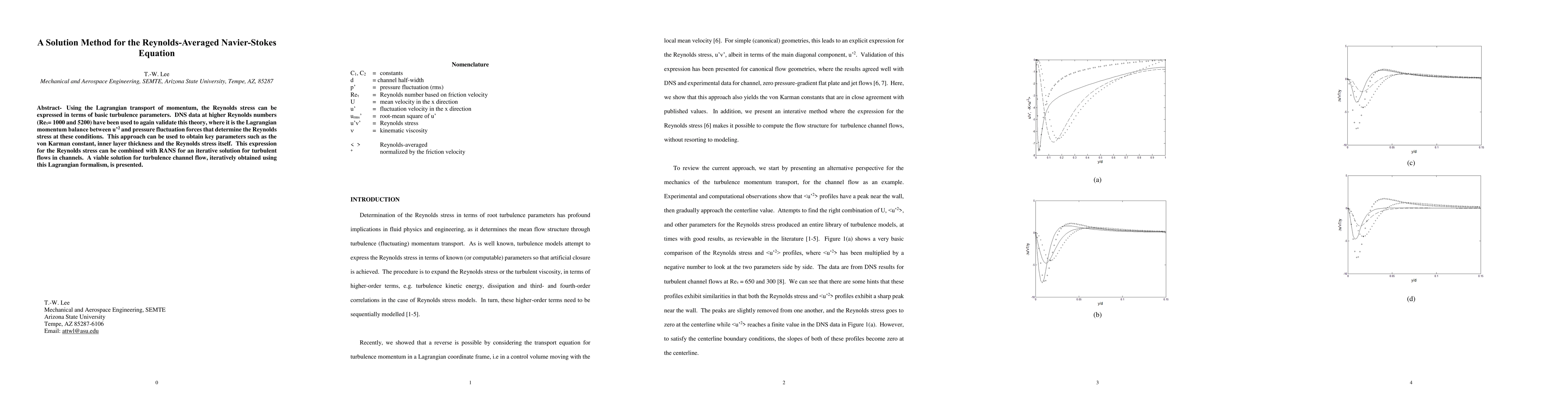 Using the Lagrangian transport of momentum, the Reynolds stress can be expressed in terms of basic turbulence parameters. DNS data at higher Reynolds numbers (Re= 1000 and 5200) have been used to again validate this theory, where it is the Lagrangian momentum balance between u2 and pressure fluctuation forces that determine the Reynolds stress at these conditions. This approach can be used to obtain key parameters such as the von Karman constant, inner layer thickness and the Reynolds stress itself. This expression for the Reynolds stress can be combined with RANS for solutions for turbulent channel and jet flows. Examples of these solutions are presented.