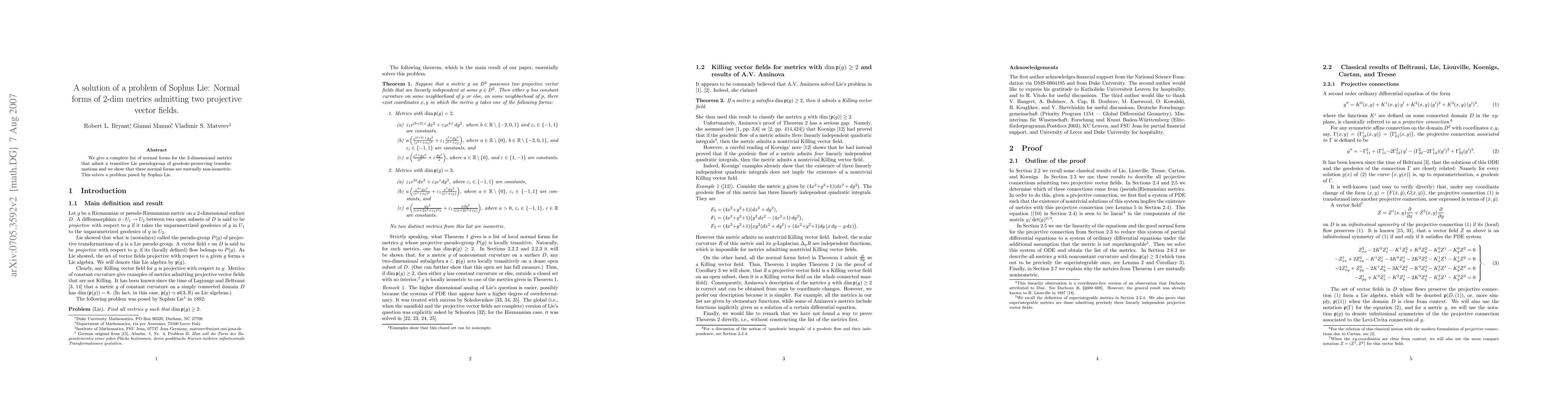 The paper provides a comprehensive classification of normal forms for 2-dimensional metrics with two projective vector fields, solving a long-standing problem proposed by Sophus Lie, and demonstrates that these forms are mutually non-isometric.