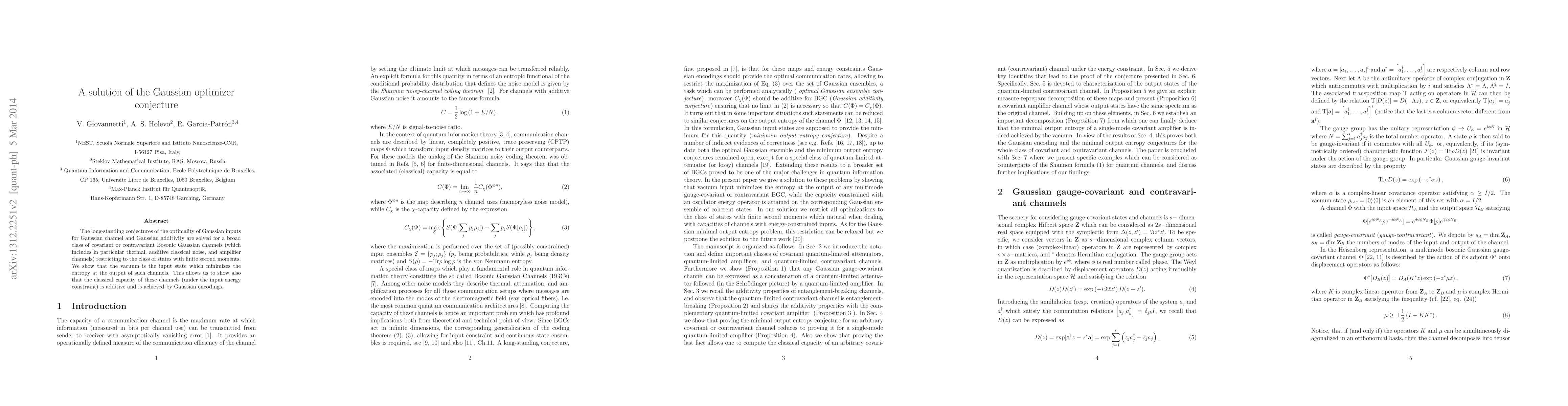 The long-standing conjectures of the optimality of Gaussian inputs for Gaussian channel and Gaussian additivity are solved for a broad class of covariant or contravariant Bosonic Gaussian channels (which includes in particular thermal, additive classical noise, and amplifier channels) restricting to the class of states with finite second moments. We show that the vacuum is the input state which minimizes the entropy at the output of such channels. This allows us to show also that the classical capacity of these channels (under the input energy constraint) is additive and is achieved by Gaussian encodings.