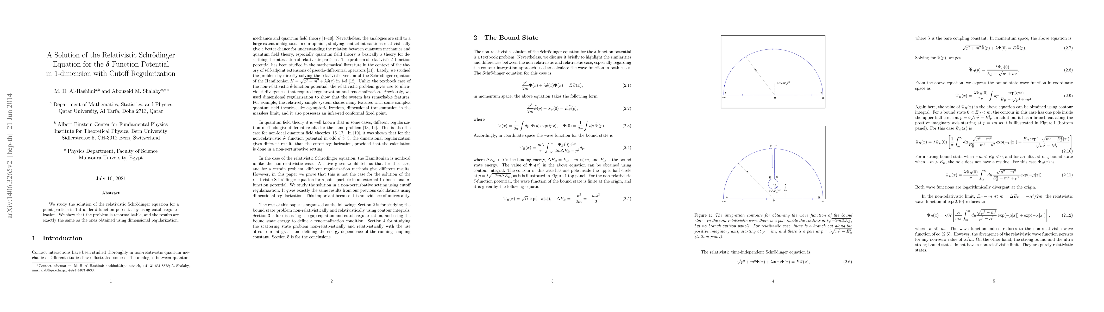This paper investigates the solution of the relativistic Schrödinger equation for a 1-dimensional $\delta$-function potential using cutoff regularization. The authors demonstrate that the problem is renormalizable and yield results identical to those obtained via dimensional regularization.