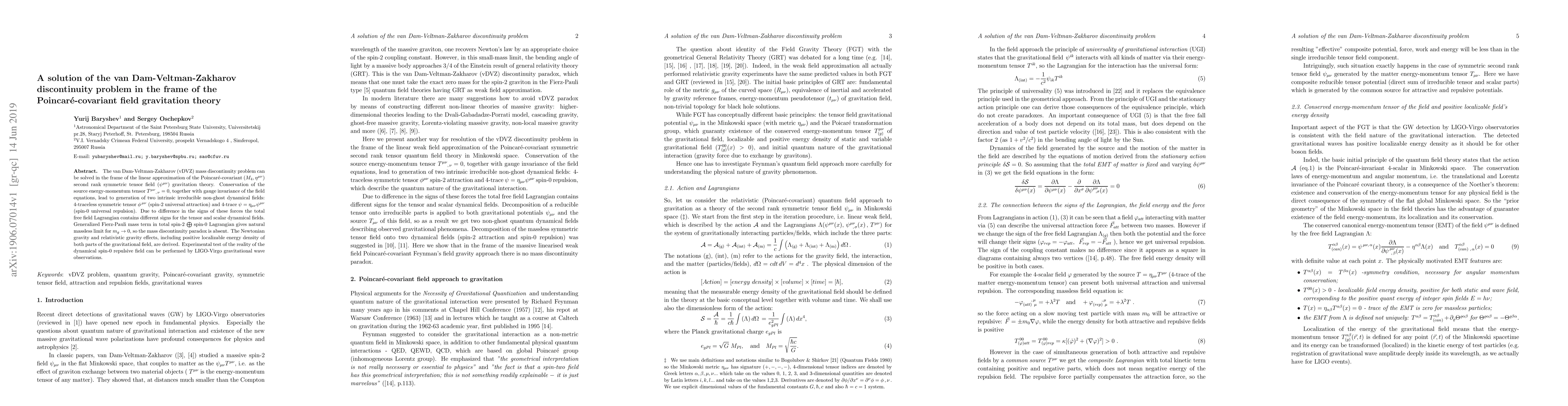 The paper proposes a solution to the van Dam-Veltman-Zakharov discontinuity problem in relativistic gravity, utilizing Poincare-covariant tensor field theory. It introduces two non-ghost dynamical fields - a spin-2 tensor for attraction and a spin-0 tensor for repulsion - which resolve the mass discontinuity paradox and ensure a massless limit. The theory also predicts observable effects, including Newtonian gravity and localizable energy density, testable via LIGO-Virgo gravitational wave observations.