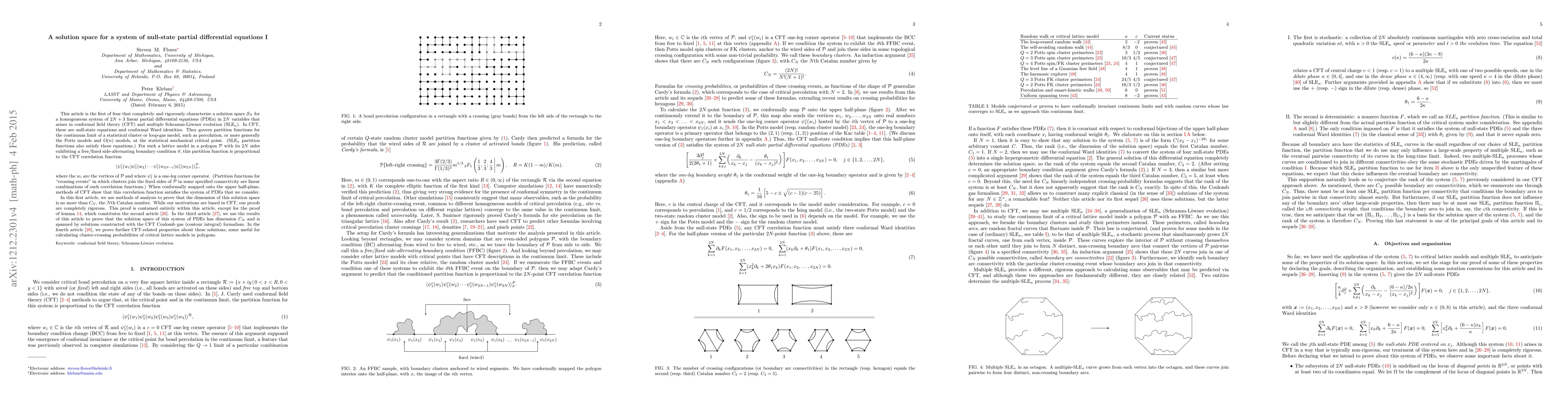 This paper investigates a homogeneous system of $2N+3$ linear partial differential equations in $2N$ variables arising in conformal field theory and Schramm-Lowner evolution, establishing that the dimension of the solution space is no more than $C_N$, the $N$th Catalan number. The subsequent articles will further characterize the solution space and its properties.