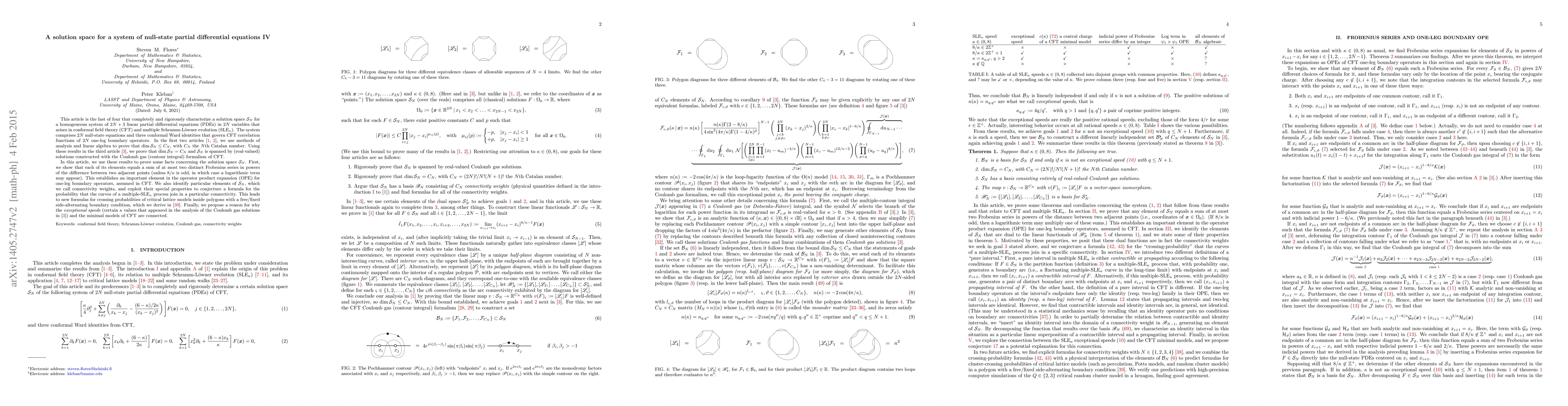 This article is the last of four that completely characterize a solution space $\mathcal{S}_N$ for a homogeneous system of $2N+3$ linear partial differential equations (PDEs) in $2N$ variables that arises in conformal field theory (CFT) and multiple Schramm-Loewner evolution (SLE). The system comprises $2N$ null-state equations and three conformal Ward identities that govern CFT correlation functions of $2N$ one-leg boundary operators. In the first two articles, we use methods of analysis and linear algebra to prove that $\dim\mathcal{S}_N\leq C_N$, with $C_N$ the $N$th Catalan number. Building on these results in the third article, we prove that $\dim\mathcal{S}_N=C_N$ and $\mathcal{S}_N$ is spanned by (real-valued) solutions constructed with the Coulomb gas (contour integral) formalism of CFT. In this article, we use these results to prove some facts concerning the solution space $\mathcal{S}_N$. First, we show that each of its elements equals a sum of at most two distinct Frobenius series in powers of the difference between two adjacent points (unless $8/\kappa$ is odd, in which case a logarithmic term may appear). This establishes an important element in the operator product expansion (OPE) for one-leg boundary operators, assumed in CFT. We also identify particular elements of $\mathcal{S}_N$, which we call connectivity weights, and exploit their special properties to conjecture a formula for the probability that the curves of a multiple-SLE$_\kappa$ process join in a particular connectivity. Finally, we propose a reason for why the "exceptional speeds" (certain $\kappa$ values that appeared in the analysis of the Coulomb gas solutions in the third article) and the minimal models of CFT are connected.