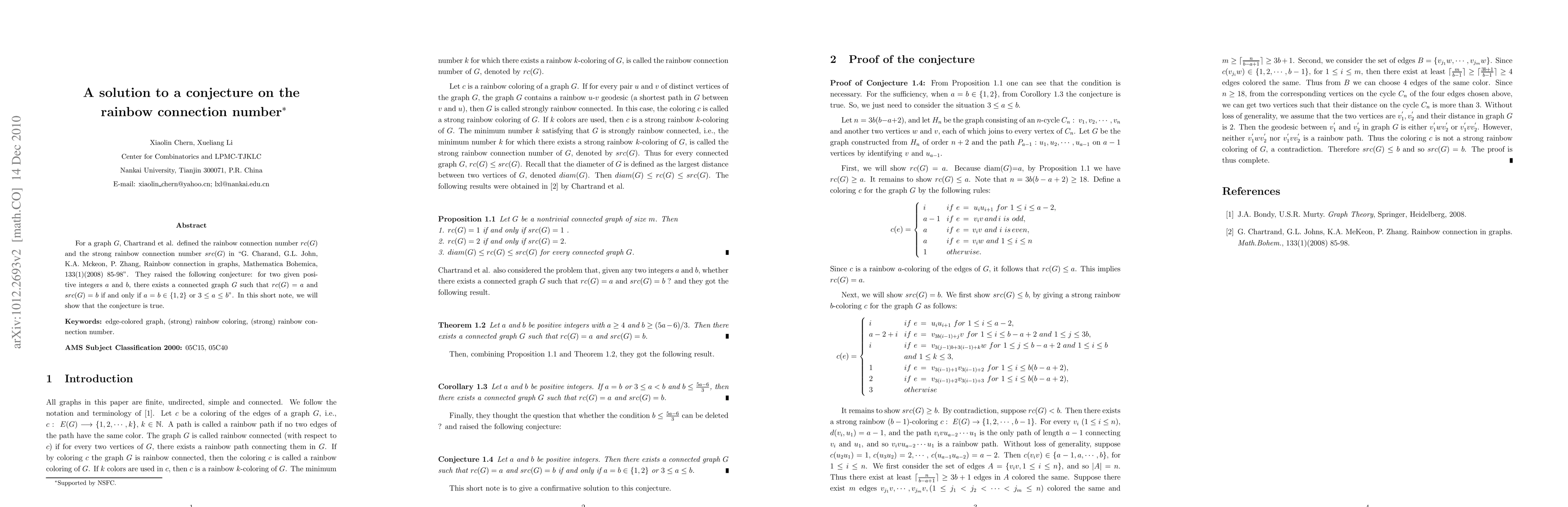This paper confirms the conjecture by Chartrand et al. regarding the rainbow connection number $rc(G)$ and the strong rainbow connection number $src(G)$ in graphs, proving that such a graph exists if and only when $a=b\in\{1,2\}$ or $3\leq a\leq b$.