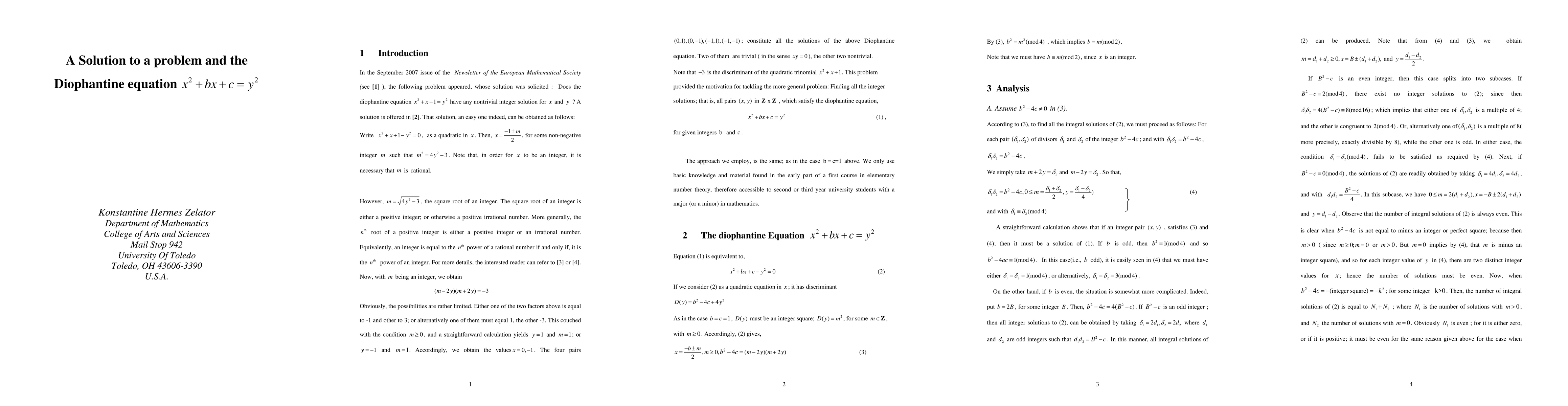 We prove that for given integers b and c, the diophantine equation x^2+bx+c=y^2, has finitely many integer solutions(i.e. pairs in ZxZ),in fact an even number of such solutions(including the zero or no solutions case).We also offer an explicit description of the solution set. Such a description depends on the form of the integer b^2-4c. Some Corollaries do follow. Furthermore, we show that the said equation has exactly two integer solutions, precisely when b^2-4c= 1,4,16,-4,or-16. In each case we list the two solutions in terms of the coefficients b and c.