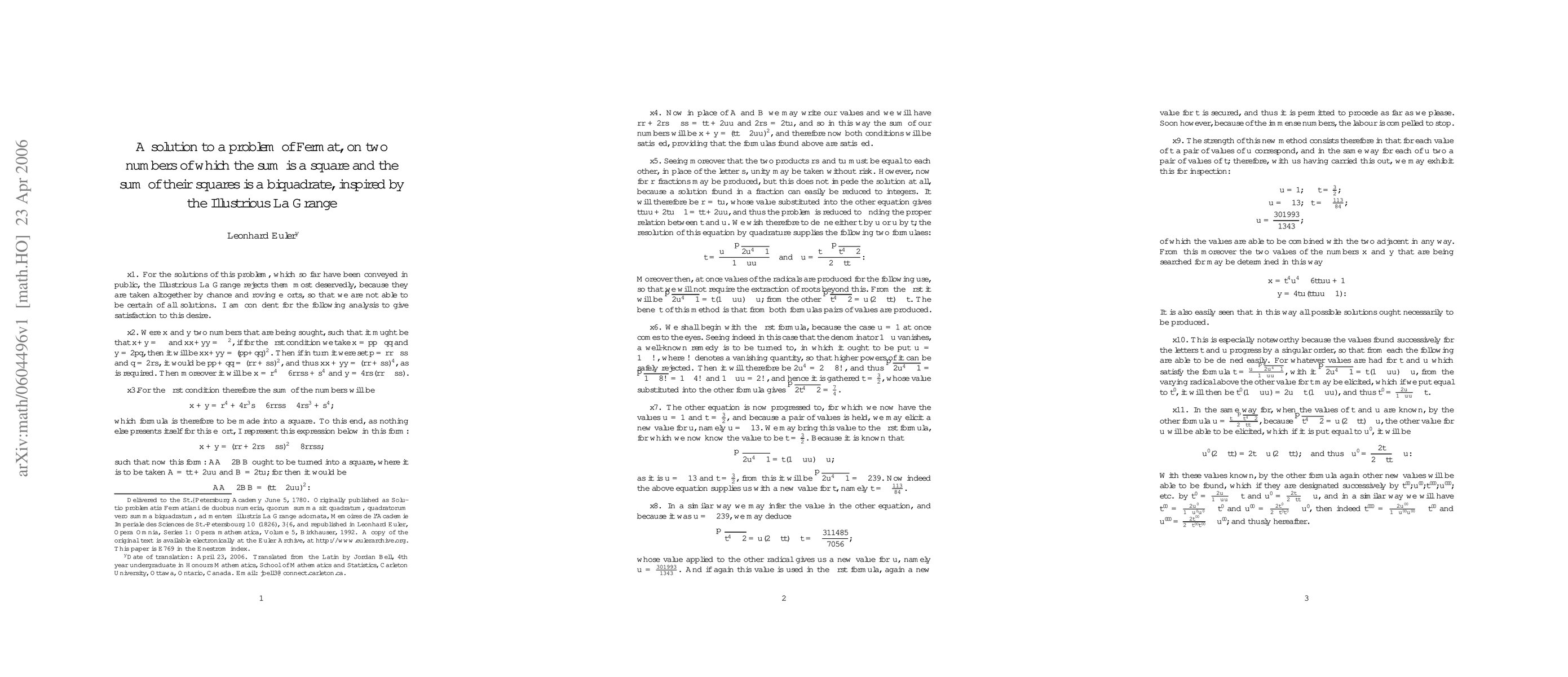 Euler wants to find rational numbers (integers) x and y such that x+y is a square and x^2+y^2 is a fourth power. He parametrizes these with two other variables that satisfy certain equations.