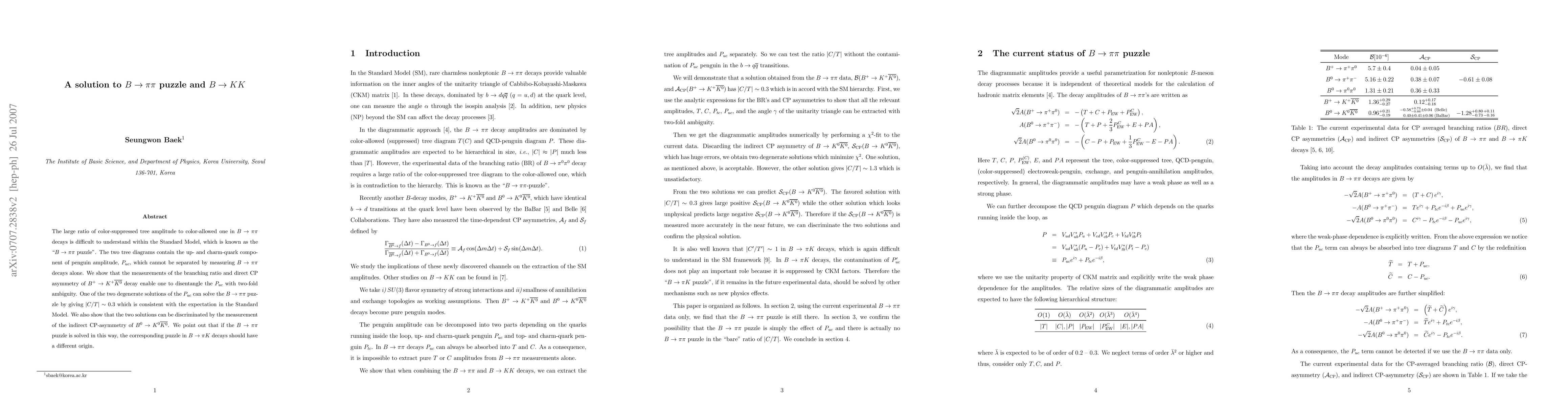 This paper proposes a solution to the "$B \to \pi\pi$ puzzle" by disentangling the penguin amplitude $P_{uc}$ using measurements of $B^+ \to K^+ \bar{K^0}$ decay. It suggests that one of two solutions can resolve the puzzle, while the other can be distinguished via indirect CP-asymmetry measurements in $B^0 \to K^0 \ol{K^0}$ decays.