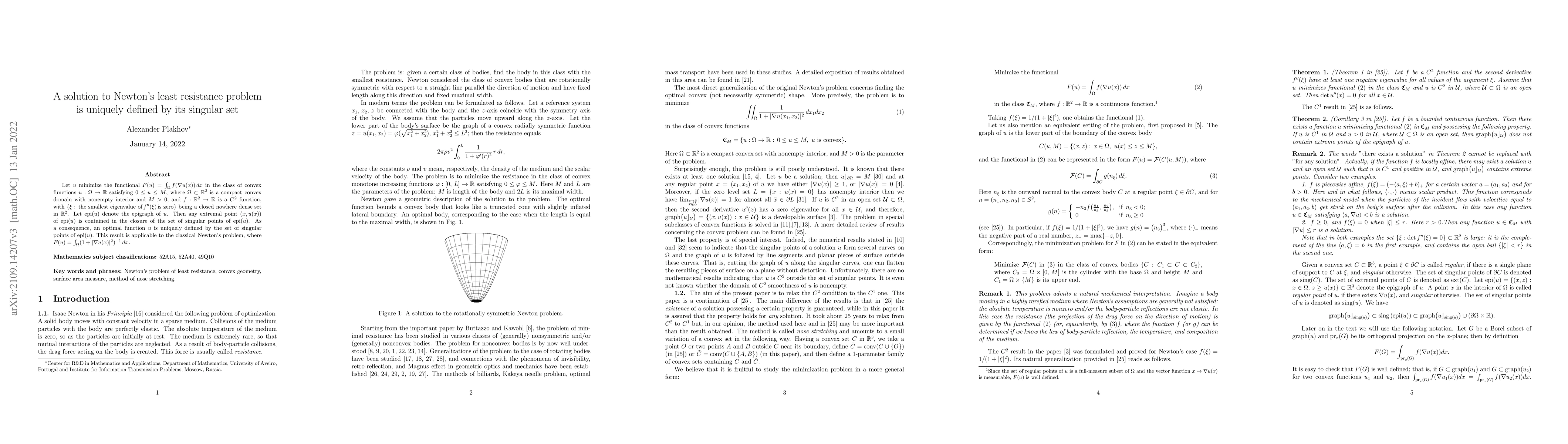 A research paper shows that a solution to Newton's least resistance problem can be uniquely defined by a set of singular points of its epigraph, providing a unique definition for an optimal function in the context of convex functions and compact domains.