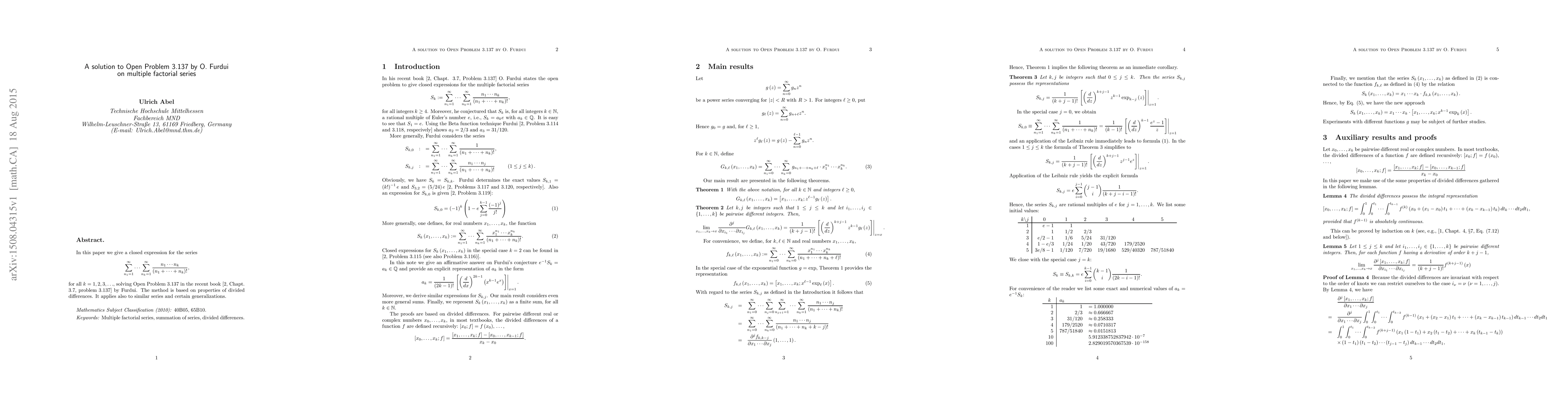In this paper we give a closed expression for a multiple factorial series, solving Open Problem 3.137 in a recent book by O. Furdui. The method is based on properties of divided differences. It applies also to similar series and certain generalizations.