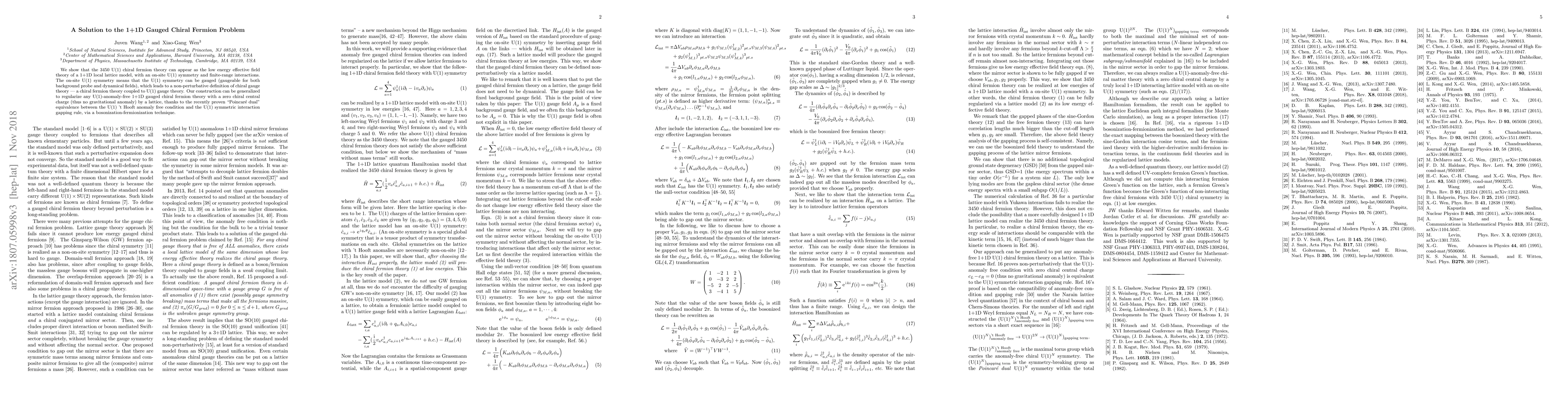 We show that the 3450 U(1) chiral fermion theory can appear as the low energy effective field theory of a 1+1D local lattice model, with an on-site U(1) symmetry and finite-range interactions. The on-site U(1) symmetry means that the U(1) symmetry can be gauged (gaugeable for both background probe and dynamical fields), which leads to a non-perturbative definition of chiral gauge theory --- a chiral fermion theory coupled to U(1) gauge theory. Our construction can be generalized to regularize any U(1)-anomaly-free 1+1D gauged chiral fermion theory with a zero chiral central charge (thus no gravitational anomaly) by a lattice, thanks to the recently proven "Poincar\'e dual" equivalence between the U(1) 't Hooft anomaly free condition and the U(1) symmetric interaction gapping rule, via a bosonization-fermionization technique.