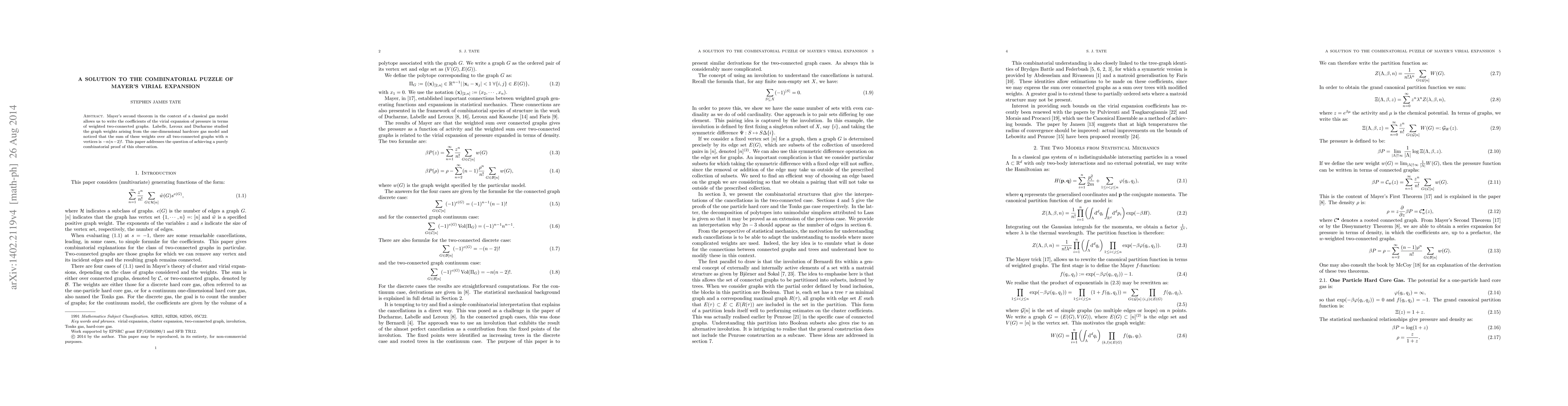 Researchers solved a long-standing problem in statistical mechanics by providing a purely combinatorial proof for the sum of weights of two-connected graphs in Mayer's virial expansion, leading to a deeper understanding of gas behavior.