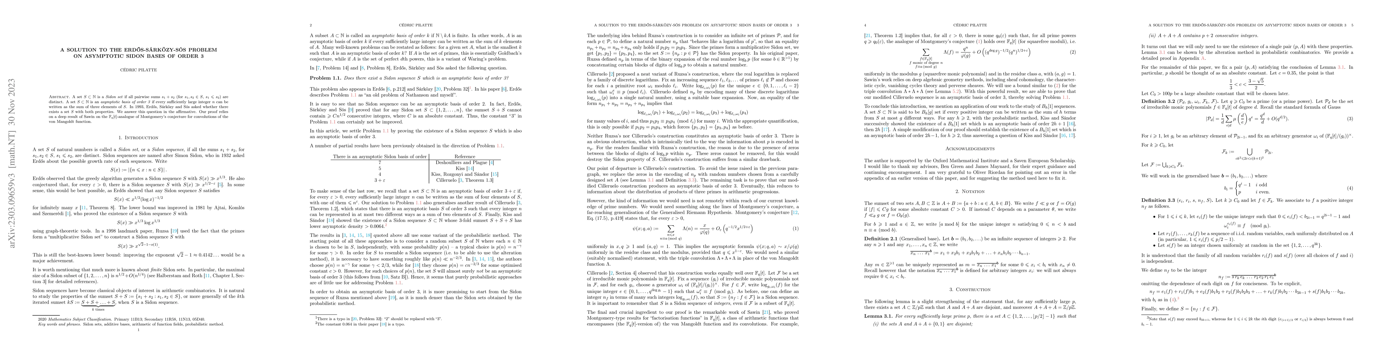 The paper presents a proof for the Erdős-Sárközy-Sós problem on asymptotic Sidon bases of order 3, utilizing a result by Sawin on the $\mathbb{F}_q[t]$-analogue of Montgomery's conjecture for convolutions of the von Mangoldt function.
