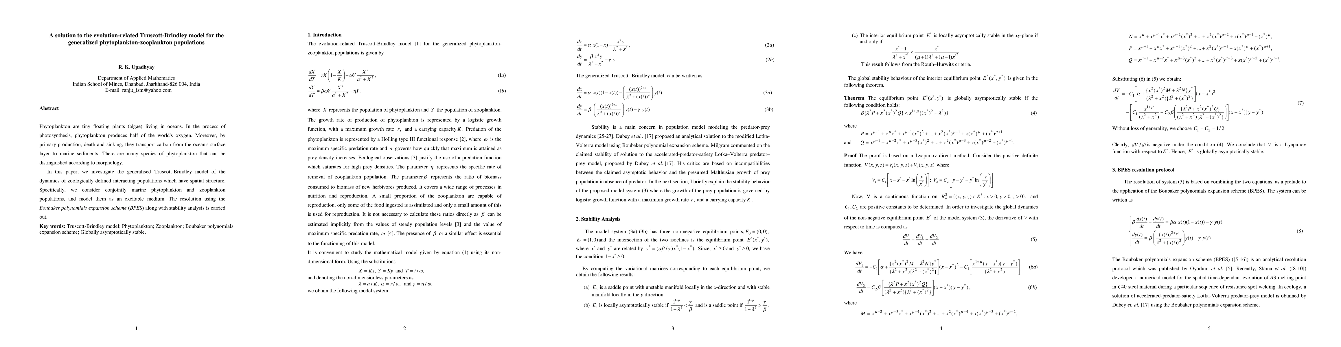 This paper investigates the generalized Truscott-Brindley model for phytoplankton-zooplankton interactions, employing the Boubaker polynomials expansion scheme to resolve the model dynamics and conduct stability analysis. The study highlights the ecological significance of phytoplankton in oxygen production and carbon transport.