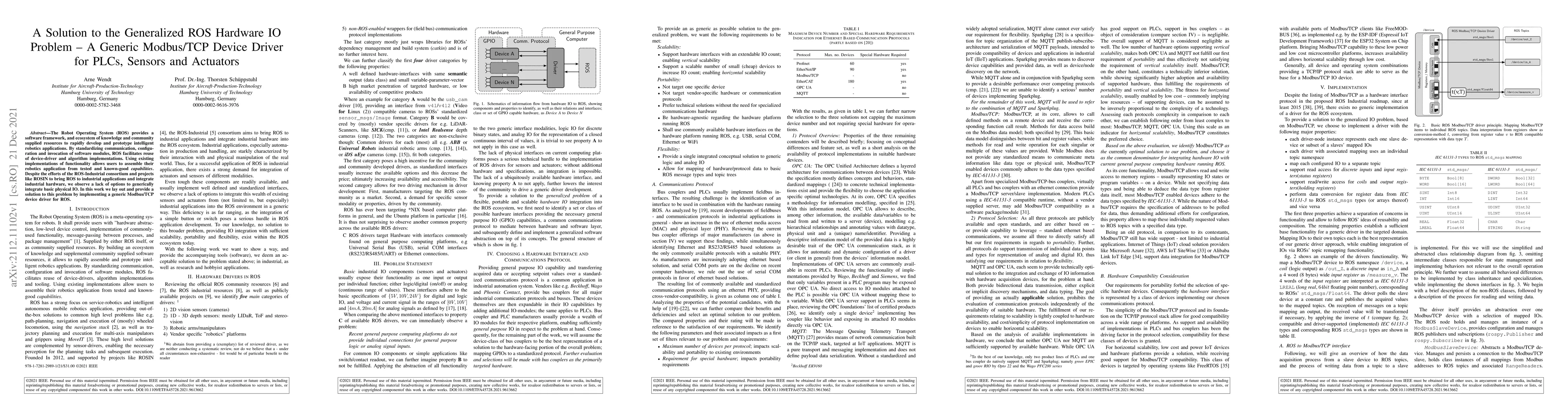 This paper presents a solution to the generalized ROS hardware IO problem by implementing a generic Modbus/TCP device driver. It aims to facilitate the integration of various industrial hardware like PLCs, sensors, and actuators into ROS-based robotics applications, addressing the current lack of options for generic physical IO.
