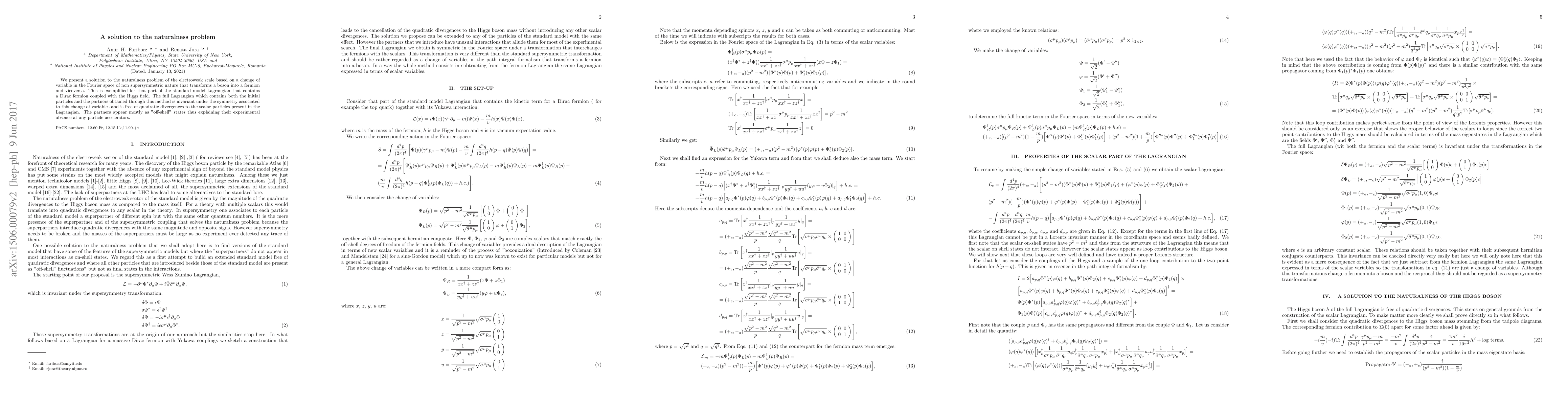 We present a solution to the naturalness problem of the electroweak scale based on a change of variable in the Fourier space of non supersymmetric nature that transforms a boson into a fermion and viceversa. This is exemplified for that part of the standard model Lagrangian that contains a Dirac fermion coupled with the Higgs field. The full Lagrangian which contains both the initial particles and the partners obtained through this method is invariant under the symmetry associated to this change of variables and is free of quadratic divergences to the scalar particles present in the Lagrangian. The partners appear mostly as "off-shell" states thus explaining their experimental absence at any particle accelerators.