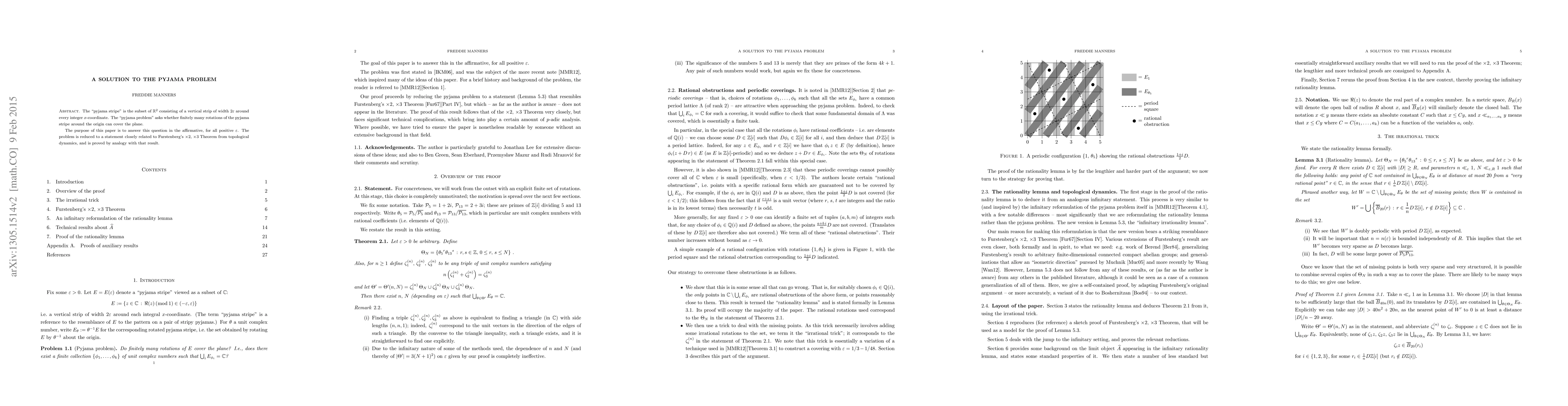 The "pyjama stripe" is the subset of $\mathbb{R}^2$ consisting of a vertical strip of width $2 \varepsilon$ around every integer $x$-coordinate. The "pyjama problem" asks whether finitely many rotations of the pyjama stripe around the origin can cover the plane. The purpose of this paper is to answer this question in the affirmative, for all positive $\varepsilon$. The problem is reduced to a statement closely related to Furstenberg's $\times 2,\, \times 3$ Theorem from topological dynamics, and is proved by analogy with that result.