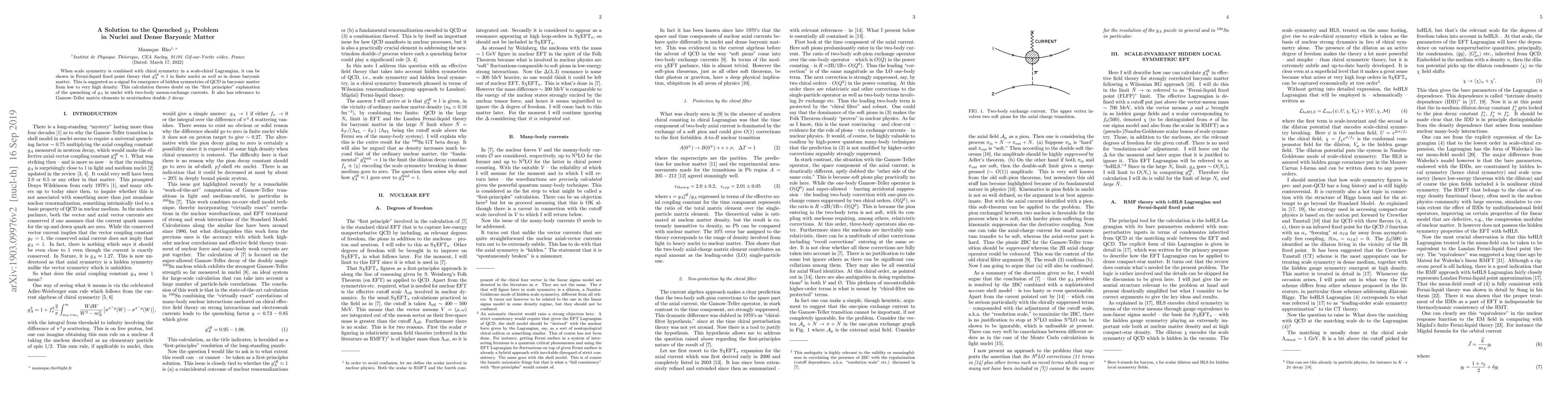 When scale symmetry is combined with chiral symmetry in a scale-chiral Lagrangian, it can be shown in Fermi-liquid fixed point theory that $g_A^{\rm eff}\approx 1$ in finite nuclei {\it as well as} in dense baryonic matter. This is suggested as a signal for emergence of hidden symmetries of QCD in baryonic matter from low to very high density. This calculation throws doubt on the "first principles" explanation of the quenching of $g_A$ in nuclei with two-body meson-exchange currents. It also has relevance to Gamow-Teller matrix elements in neutrinoless double $\beta$ decay.