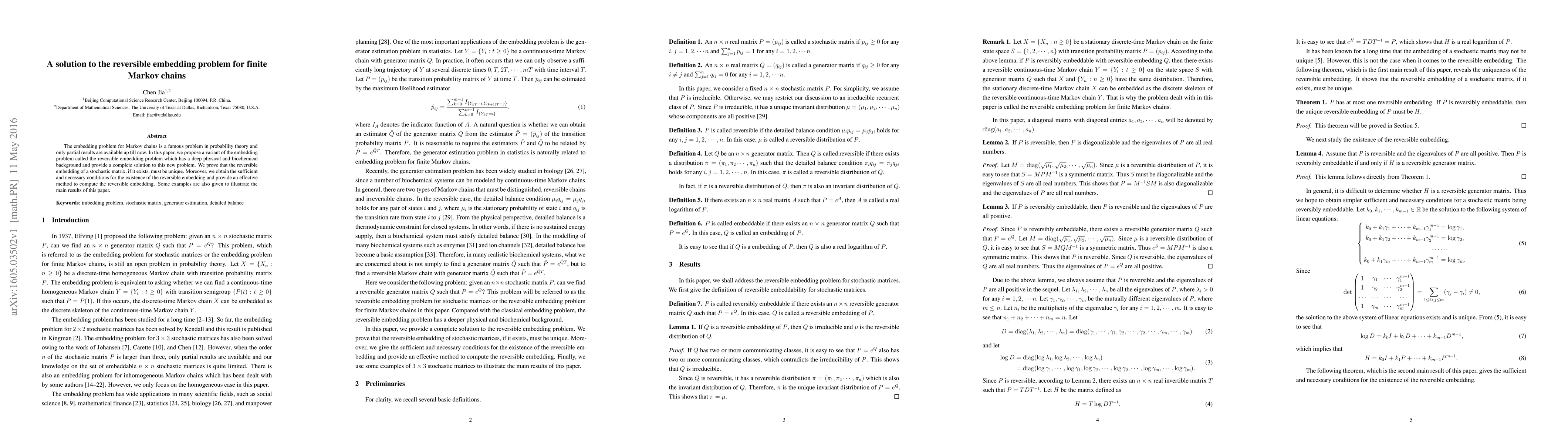 Researchers develop a solution to the reversible embedding problem for Markov chains, proving uniqueness and providing conditions for existence and computation methods.