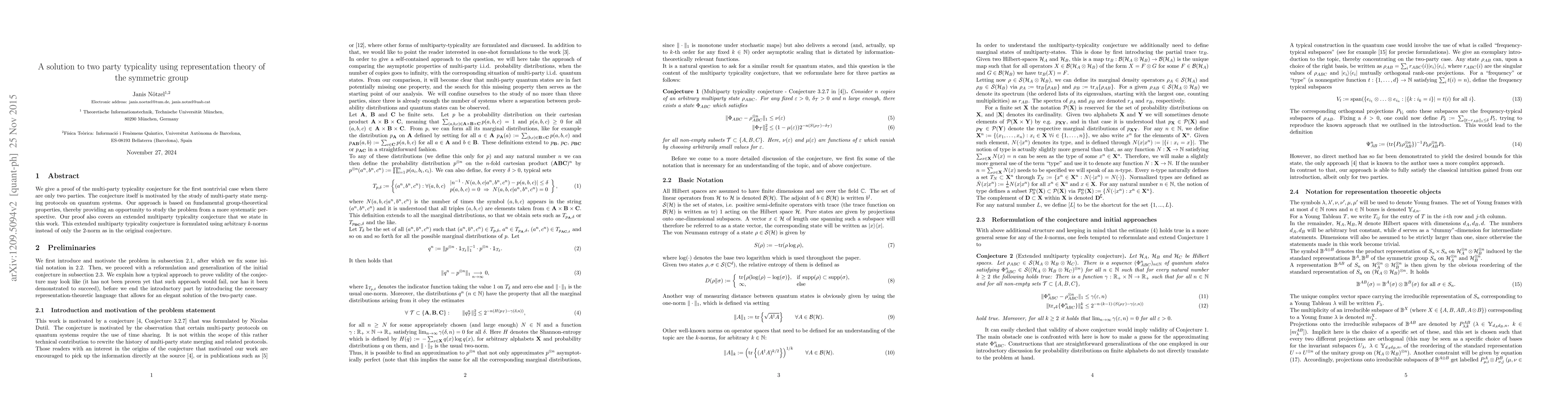 We give a proof of the multi-party typicality conjecture for the first nontrivial case when there are only two parties. The conjecture itself is motivated by the study of multi-party state merging protocols on quantum systems. Our approach is based on fundamental group-theoretical properties, thereby providing an opportunity to study the problem from a more systematic perspective. Our proof also covers an extended multiparty typicality conjecture that we state in this work. This extended multiparty typicality conjecture is formulated using arbitrary $k$-norms instead of only the $2$-norm as in the original conjecture.