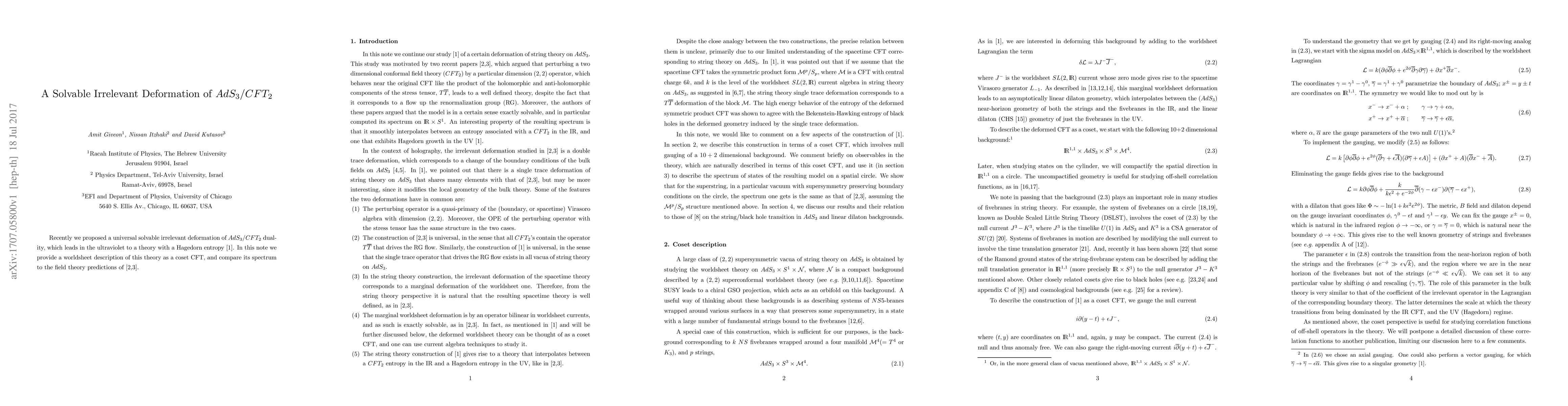 This paper proposes a solvable irrelevant deformation of the $AdS_3/CFT_2$ duality, resulting in a theory with Hagedorn entropy in the ultraviolet. It presents a worldsheet description of this theory as a coset conformal field theory and compares its spectrum to field theory predictions.