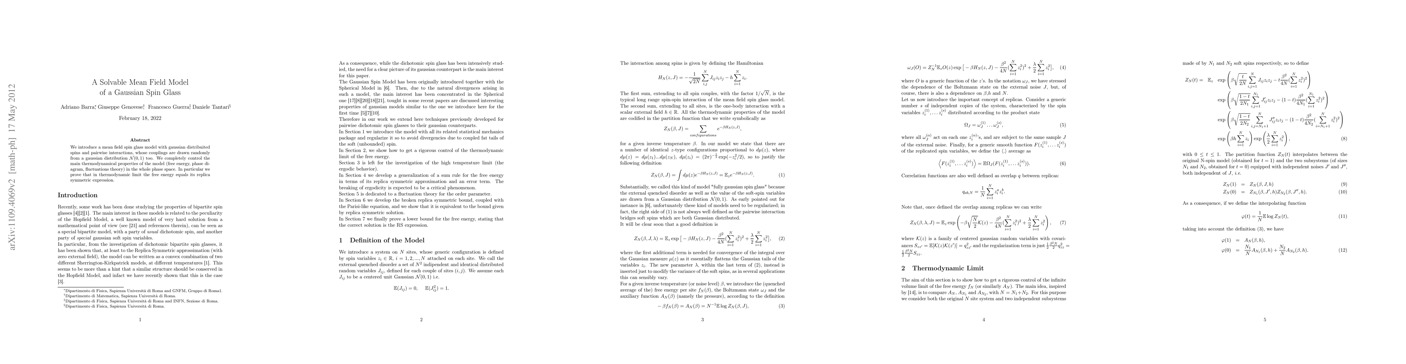 This paper presents a solvable mean field model for Gaussian spin glasses, characterized by Gaussian-distributed spins and random pairwise interactions. The authors demonstrate full control over the model's thermodynamic properties, proving that in the thermodynamic limit, the free energy matches its replica symmetric expression.
