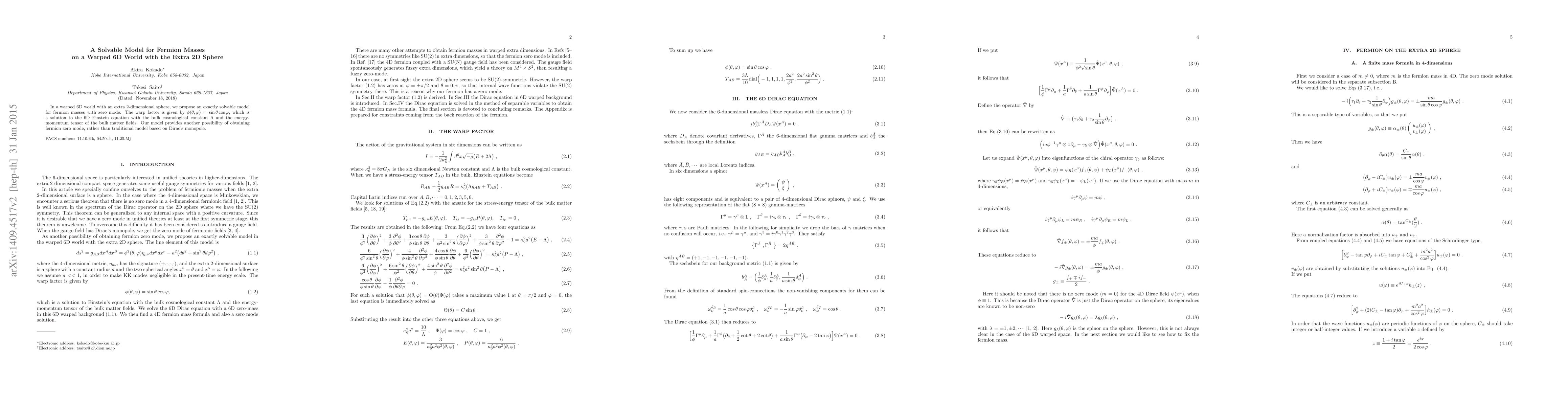 The research proposes an exactly solvable model for fermion masses in a warped 6D world with an extra 2D sphere, deriving a finite mass formula for 4D fermions and a zero mode solution.